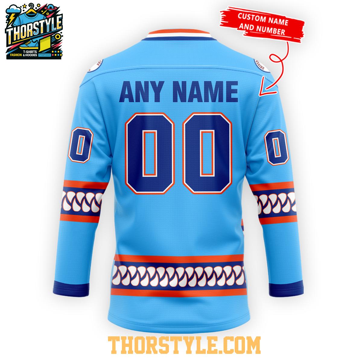 Imagine the impact of wearing this personalized hockey jersey to a game, a spirited watch party, or even casually around town. It's a versatile garment that can be easily dressed up or down to suit any occasion. Pair it with jeans and sneakers for a relaxed and casual look, or coordinate it with other Gators apparel for a complete and immersive fan experience. To maintain the pristine condition of your hockey jersey, we recommend machine washing it inside out in cold water and hanging it to dry. This simple care routine will help preserve the vibrant colors and prevent any potential damage to the personalized elements, ensuring that your jersey remains a cherished symbol of your Gators fandom for years to come.