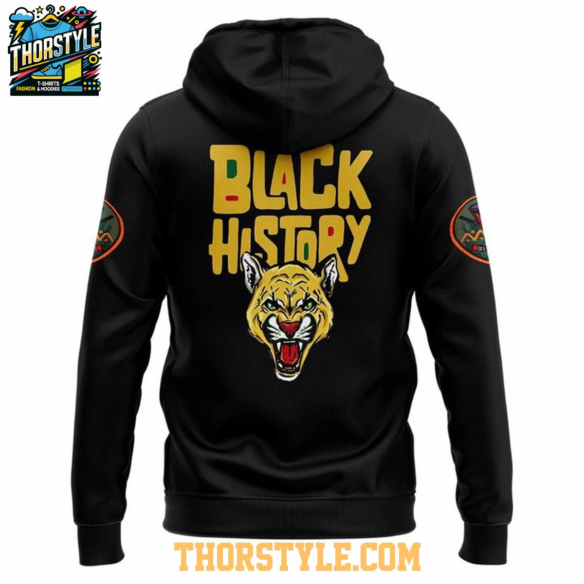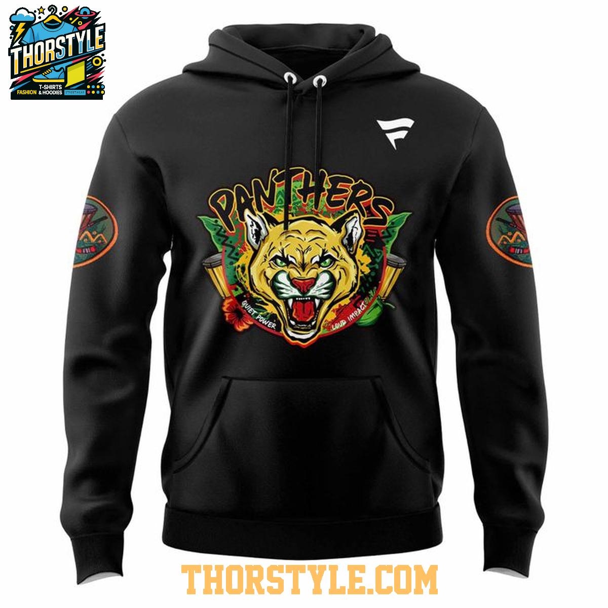 This hoodie t-shirt features a striking design that incorporates the iconic Panthers logo with elements commemorating Black History Night. The graphics are bold and vibrant, ensuring that your team pride shines through. The comfortable hood provides extra warmth on cooler days, while the t-shirt style body allows for breathability and freedom of movement. It's the perfect choice for game days, casual outings, or simply relaxing at home.