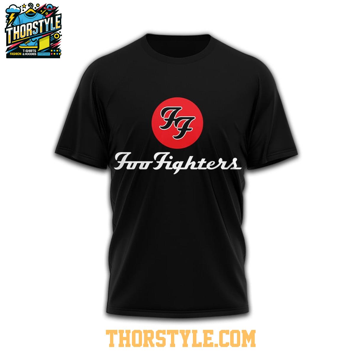 Crafted in classic black, the front of this premium T-shirt proudly displays the iconic Foo Fighters 'FF' logo, rendered in a striking red circle. This instantly recognizable emblem serves as a powerful symbol of your allegiance to one of rock's most influential bands, a beacon for fellow enthusiasts and a statement piece that resonates with decades of groundbreaking music and unforgettable shows.