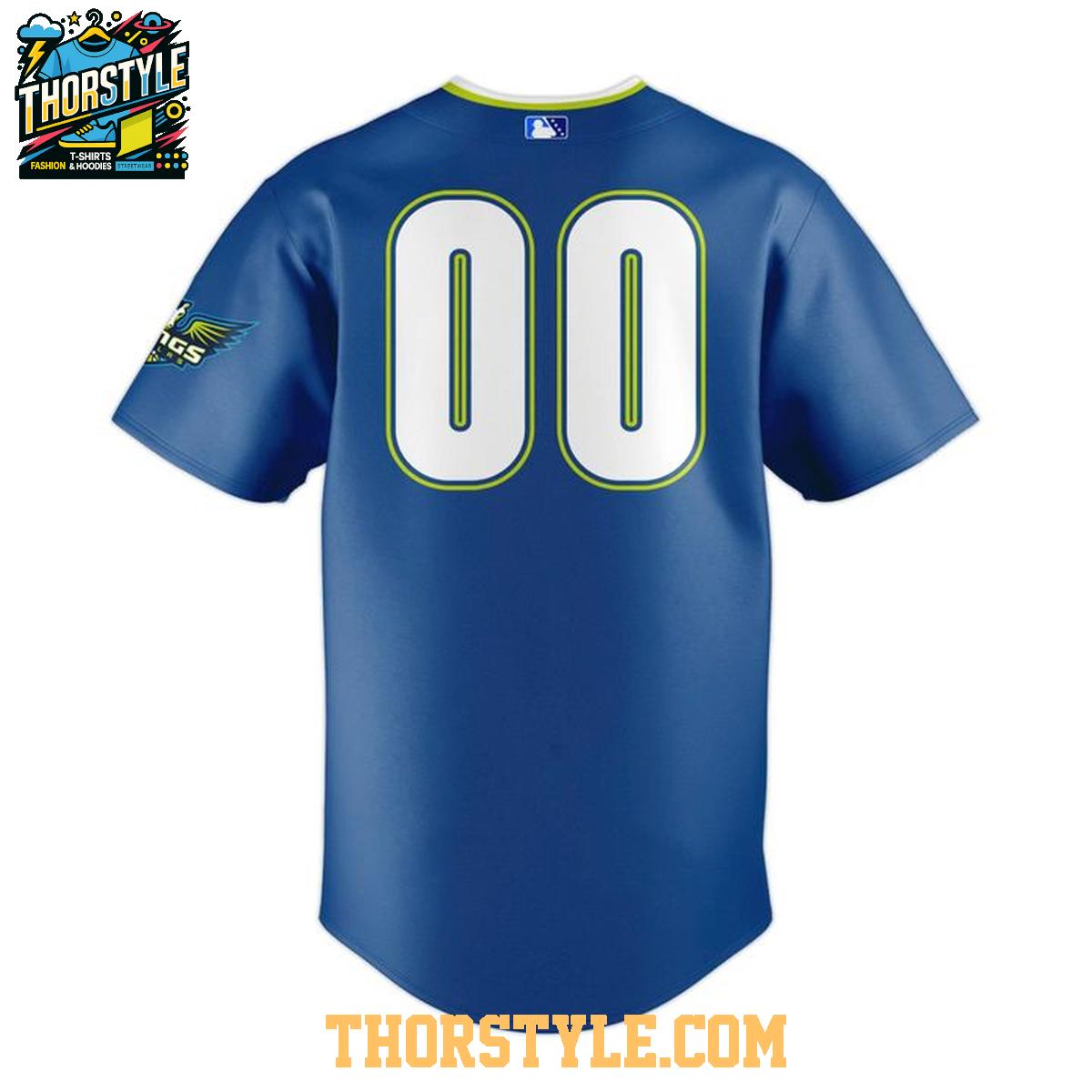 The design features a striking blend of RoughRiders and Wings elements, combining bold typography with vibrant team colors. Expect a fusion of navy, red, and electric accents, along with dynamic striping and logo-inspired graphics that reflect the identity of both franchises. The result is a visually powerful jersey that stands out from traditional baseball apparel.