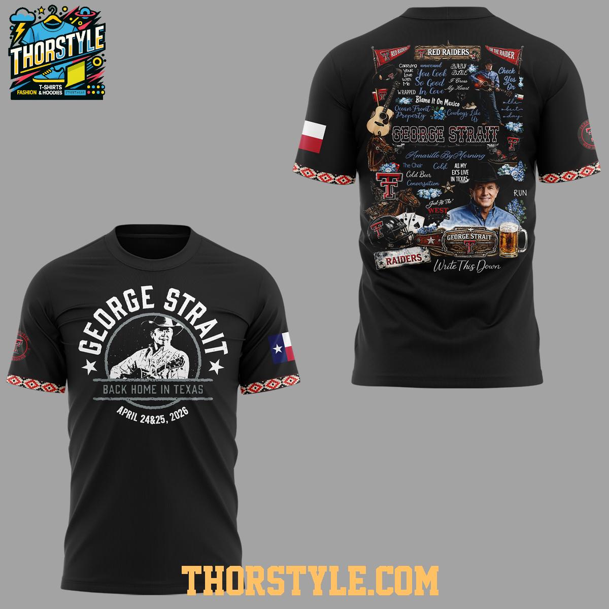 The design features a bold combination of George Strait's iconic branding alongside the Texas Tech Red Raiders logo, commemorating the special "One Last Ride 2026" tour. The graphics are screen-printed with high-quality inks, ensuring they remain vibrant and sharp wash after wash. Show your support for both a country music icon and your favorite college team.