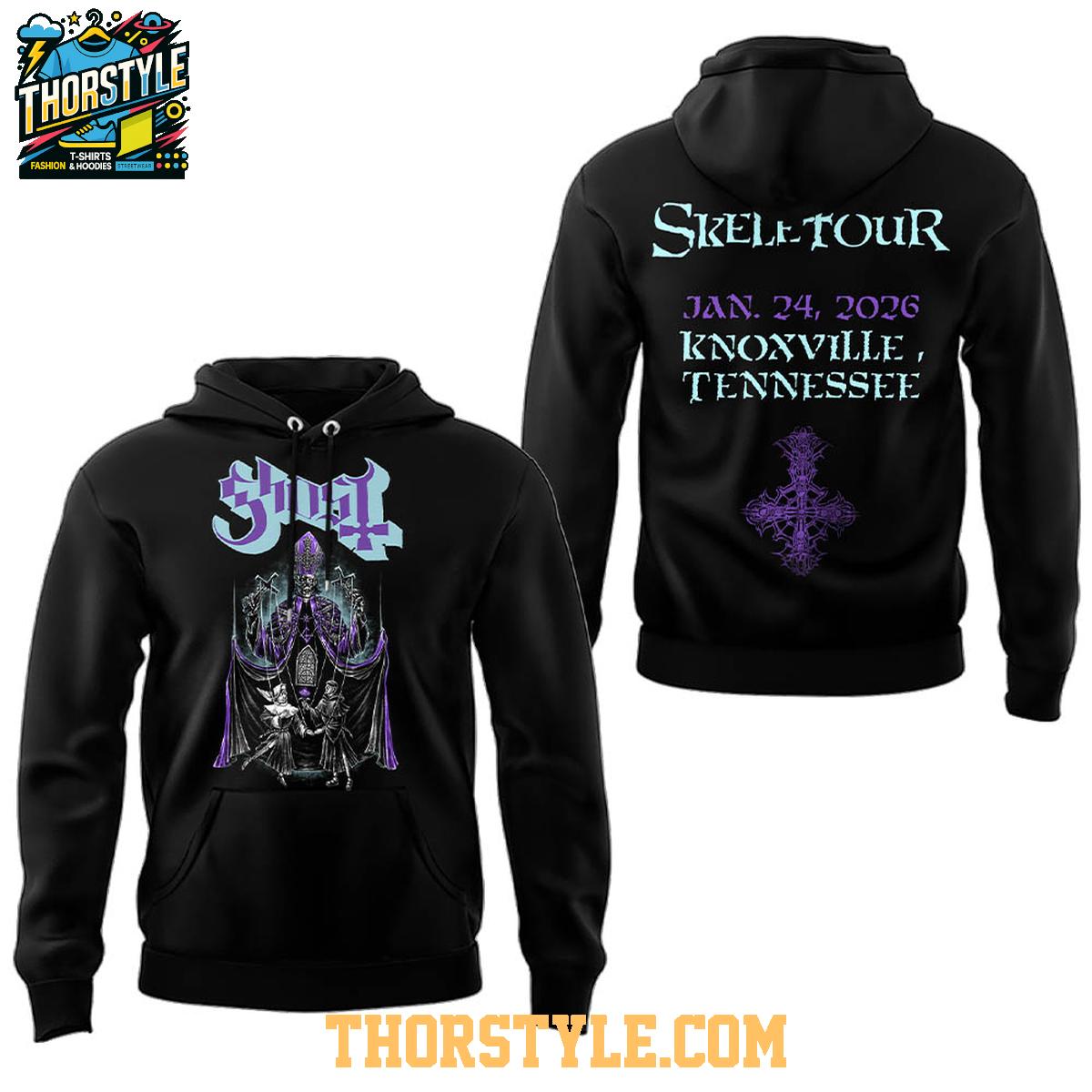 The front of the hoodie t-shirt proudly displays the iconic Ghost logo and imagery associated with the Skeletour 2026. The back commemorates the Knoxville, Tennessee show date, making it a true collector's item. The design is printed with high-quality inks to ensure vibrant colors and lasting durability, even after numerous washes.