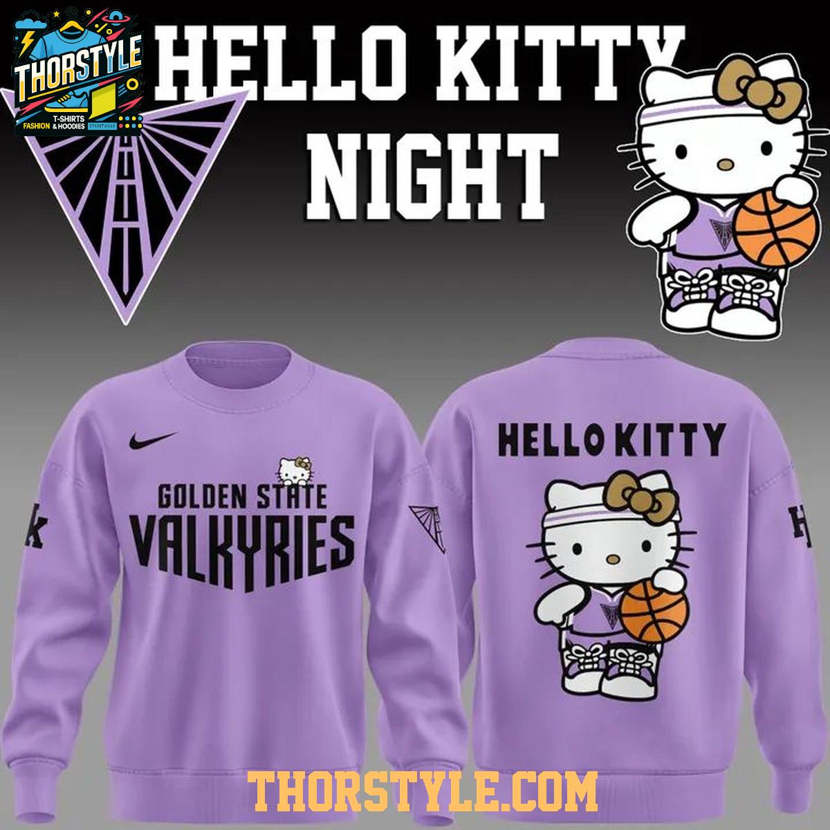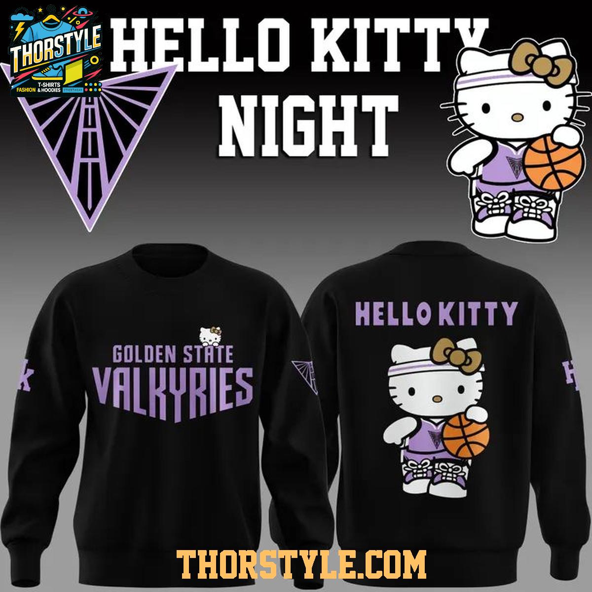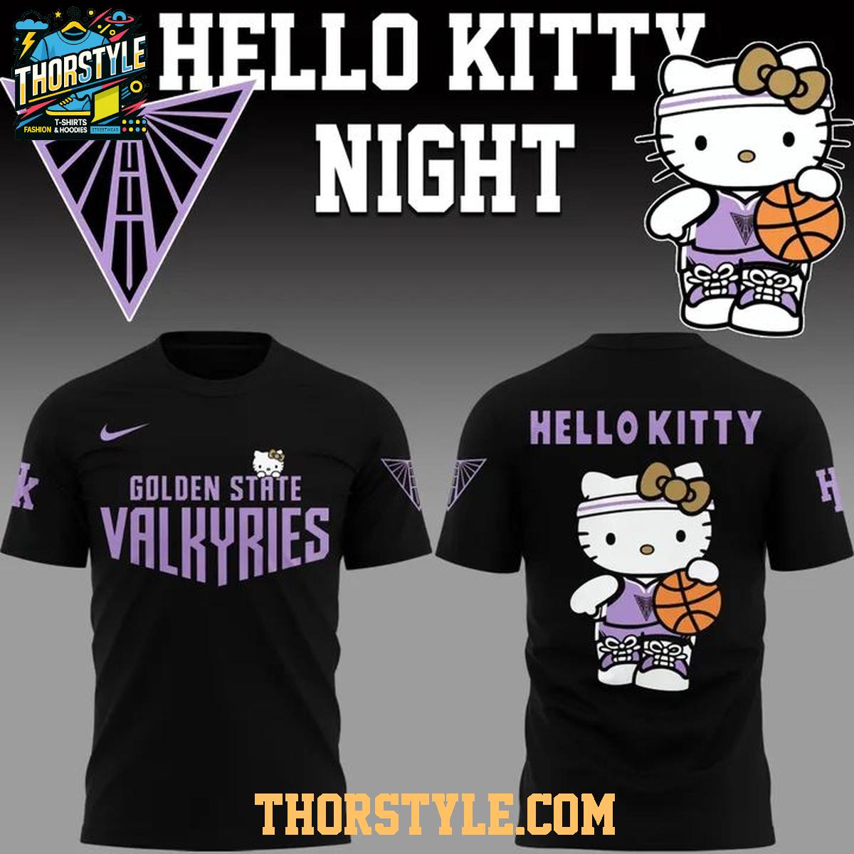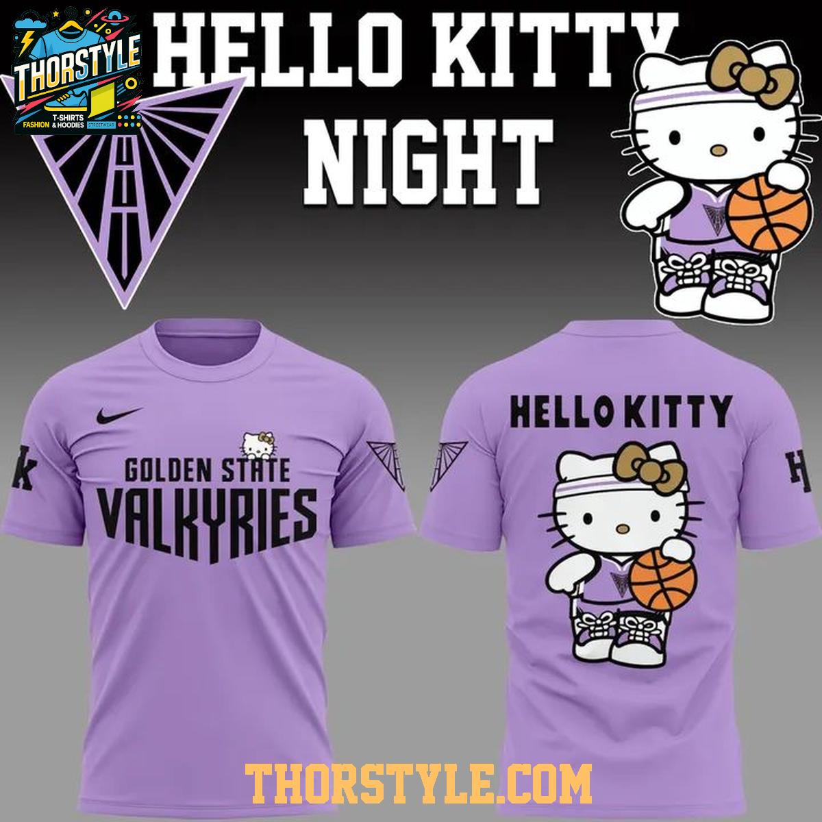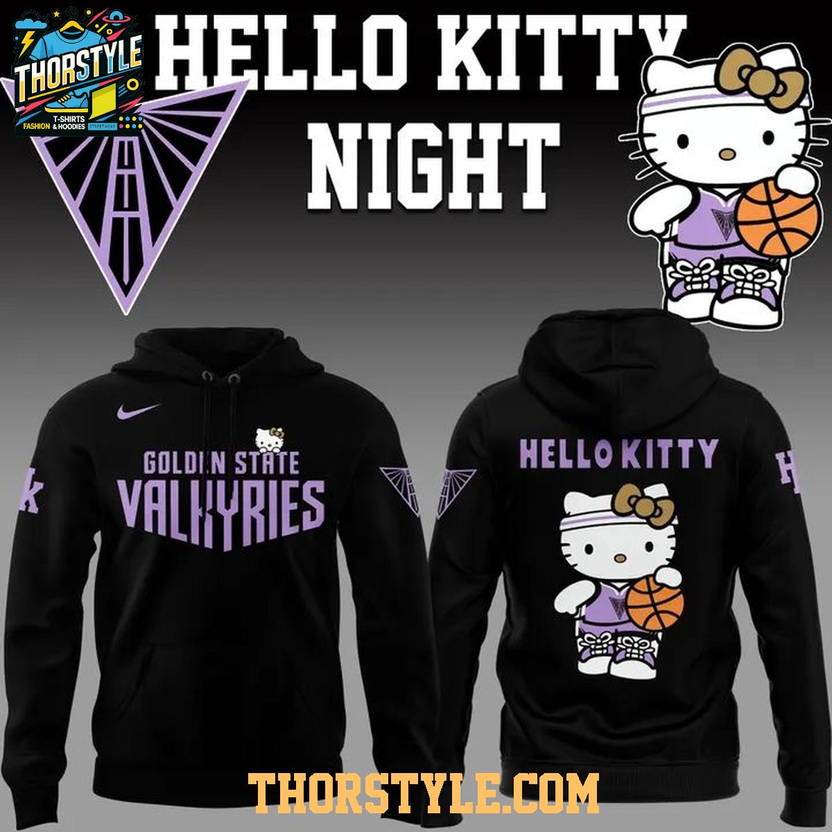 Crafted for both comfort and style, this hoodie t-shirt features a distinctive design that seamlessly blends the Valkyries' branding with charming Hello Kitty graphics. The front prominently displays "Golden State Valkyries" in a bold, eye-catching font, while the back showcases a playful Hello Kitty image sporting basketball attire, ready to hit the court. This visual statement effectively captures the high energy and excitement that defined the special Hello Kitty Night event.