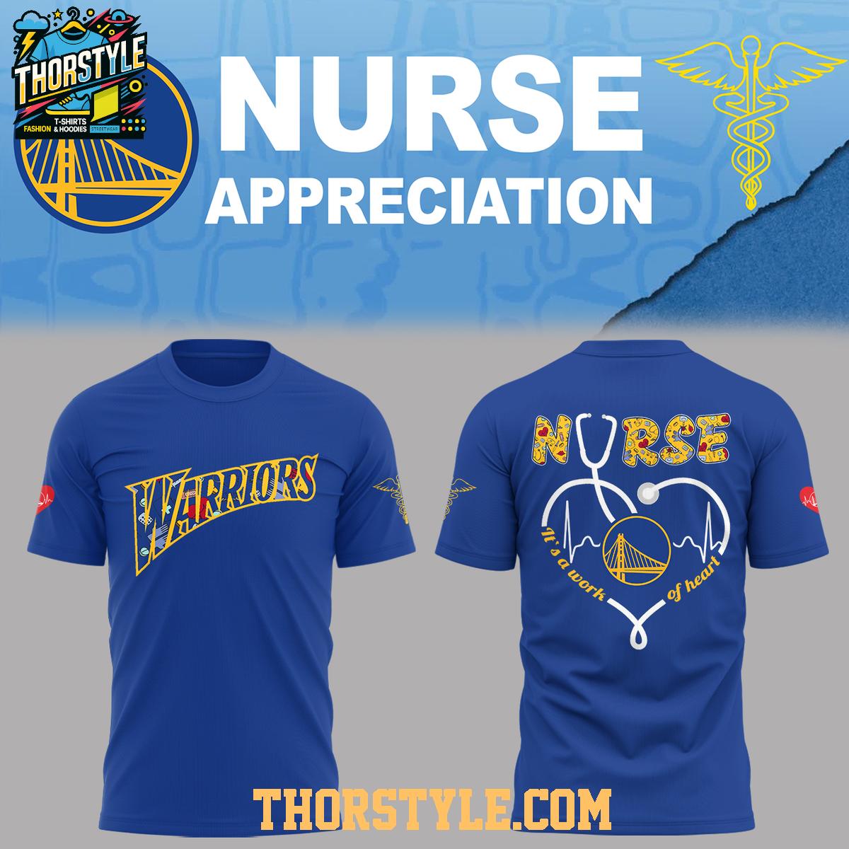 The design features the iconic Warriors logo artfully integrated with nurse-themed graphics. A stylized caduceus symbol and a creative stethoscope design, incorporating the iconic Golden Gate Bridge, symbolize the healing touch and unwavering commitment of nurses in the Bay Area. The back of the shirt proudly displays the word "Nurse" alongside the message "It's a work of heart," visually reinforcing the compassion and dedication that define their profession.