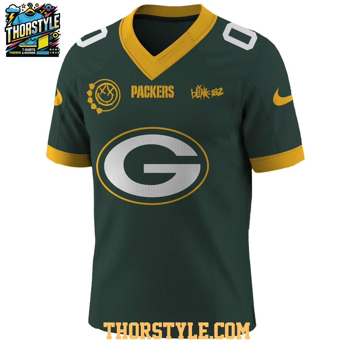 The vibrant green and gold colors of the Packers provide a striking backdrop, while strategically placed Blink-182 inspired graphics inject a touch of rebellious flair. The instantly recognizable "Smiley Face" logo is cleverly integrated with familiar Packers design elements, creating a visually compelling and harmonious blend. The back of the jersey features ample space for your personalized name, allowing you to express your individuality and represent yourself with style and pride.