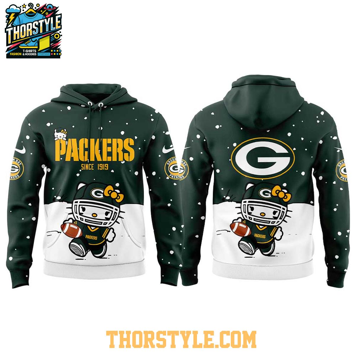 This hoodie is designed with a striking dark green base, a hue that perfectly echoes the Packers' classic colors and instantly signifies your allegiance. Adorning this backdrop is a playful snowfall pattern, creating an immediate sense of winter cheer and holiday festivity. The front prominently showcases "PACKERS SINCE 1919," honoring the team's rich, century-long heritage, alongside an irresistibly adorable Hello Kitty mascot. She is depicted fully geared up in a Packers helmet and uniform, confidently clutching a football, embodying both fierce team spirit and irresistible cuteness. Every detail is meticulously rendered, ensuring a high-quality visual experience.