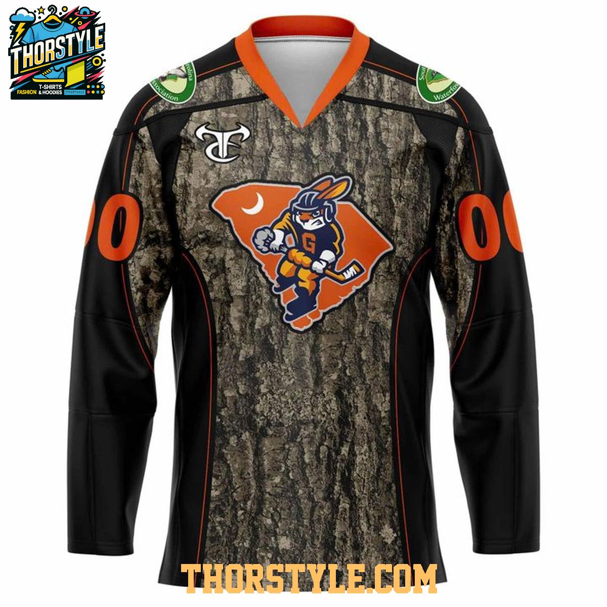 Whether you're heading to a Swamp Rabbits game, engaging in outdoor activities, or simply seeking to express your support for both the team and conservation efforts, this jersey offers unparalleled versatility. Pair it effortlessly with jeans or shorts for a relaxed, casual look, or layer it over a hoodie for added warmth during cooler weather. Its distinctive camouflage design and unmistakable team branding are sure to spark conversations, providing you with ample opportunities to share your passion for hockey and your dedication to environmental stewardship.