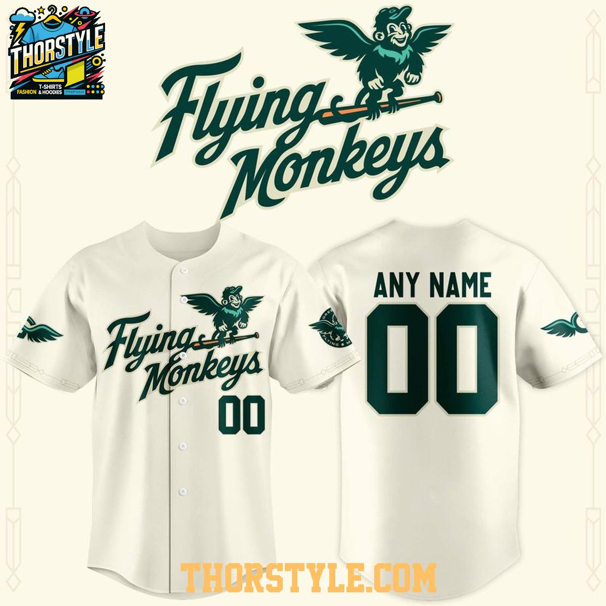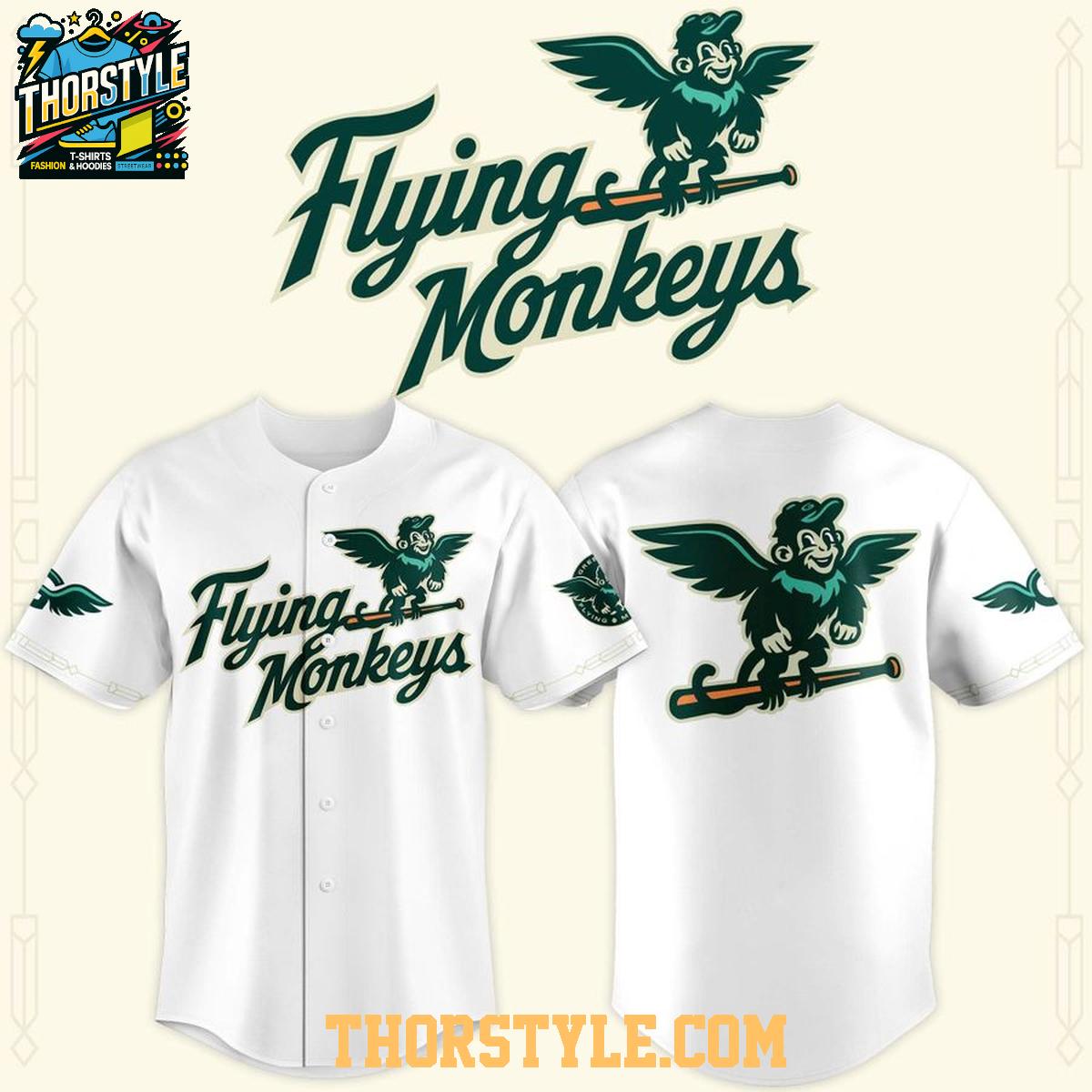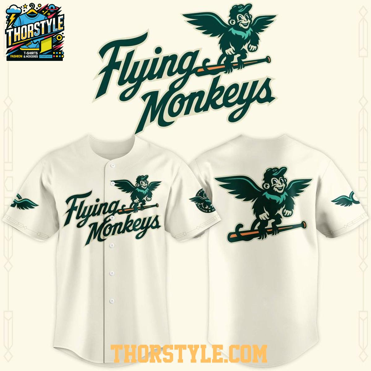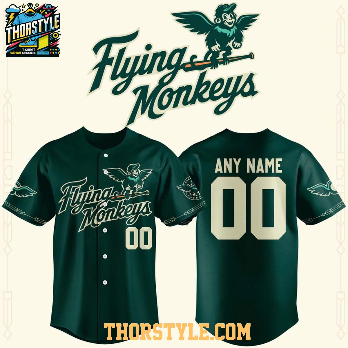 Crafted from breathable, lightweight fabric, this baseball jersey is designed for comfort and durability. The classic button-down style allows for easy wear and a relaxed fit, suitable for a wide range of body types. The emerald green color provides a vibrant backdrop for the playful "Flying Monkeys" design, a fun twist on traditional baseball aesthetics.