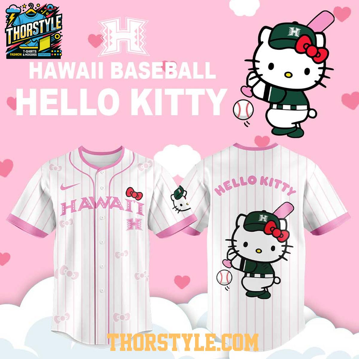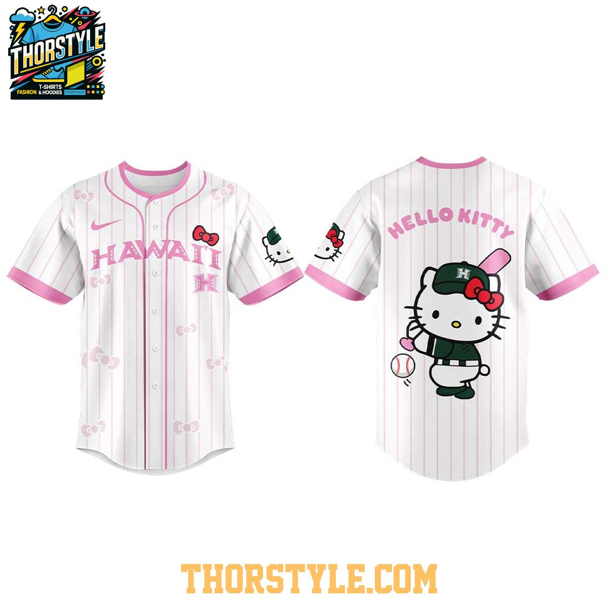 Show your team spirit with the limited edition Hawaii Rainbow Warriors Hello Kitty 2026 Stripe Night Personalized Baseball Jersey. This unique jersey blends the iconic imagery of Hello Kitty with the athletic style of the Hawaii Rainbow Warriors, creating a fun and fashionable way to support your favorite team. Perfect for game days, casual outings, or simply showing off your love for both Hello Kitty and baseball.