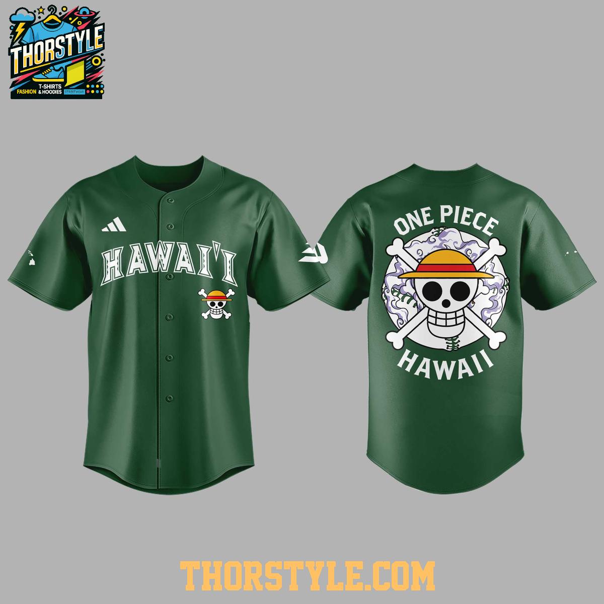 Crafted from a breathable, lightweight polyester fabric, this baseball jersey is designed for comfort and durability. The full-button front allows for easy wear, whether you prefer it buttoned up for a classic look or open over a t-shirt for a more casual style. The vibrant green color provides a striking backdrop for the "Hawaii" lettering across the chest and the distinctive One Piece-themed graphics.