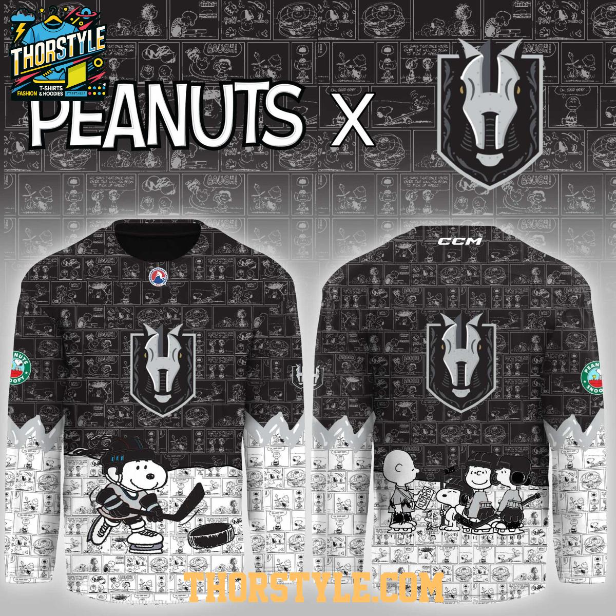 This striking hockey jersey features a bold design incorporating iconic Peanuts characters like Snoopy and Charlie Brown alongside the Henderson Silver Knights team logo. The jersey's primary color scheme reflects the team's colors, while the Peanuts artwork adds a playful and nostalgic touch. The overall effect is a visually appealing and instantly recognizable piece of fan apparel. The repeating comic strip design is sure to catch the eye.