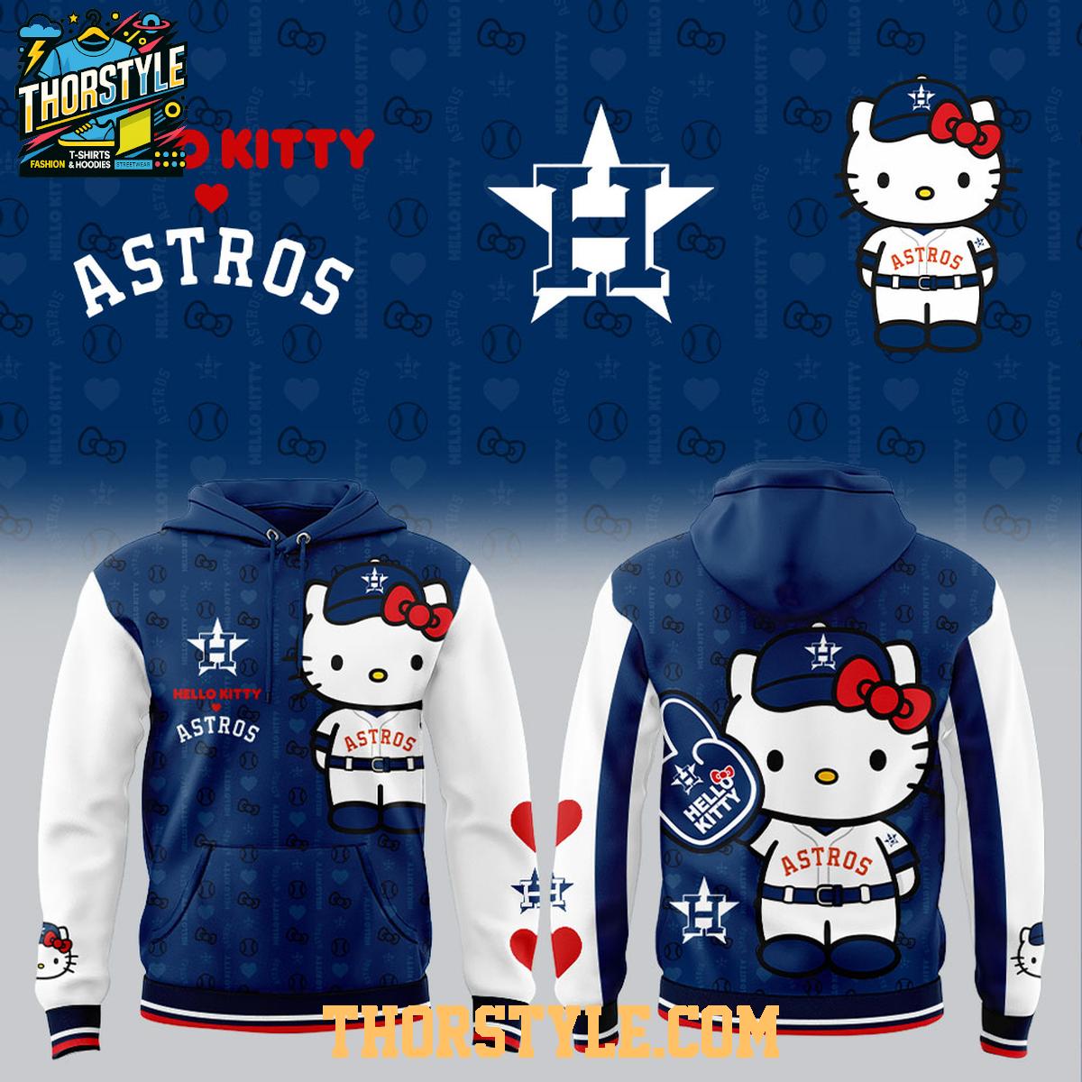 Show off your playful style and team pride with the Houston Astros Hello Kitty 2026 Night In Houston City Hoodie T-Shirt. This limited-edition piece blends the iconic identity of the Houston Astros with the irresistible charm of Hello Kitty. Designed with a modern color palette inspired by Astros team colors, the hoodie features Hello Kitty in a Houston uniform, creating a cute yet sporty aesthetic. Subtle background patterns, heart accents, and team logos add depth to the design, making it a standout item for fans who love both baseball and kawaii culture.
