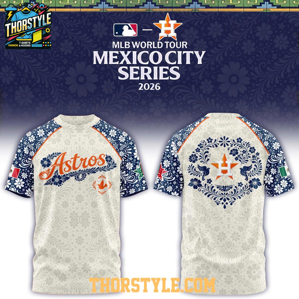 This hoodie shirt features a bold and eye-catching design that intricately weaves together traditional Mexican floral patterns with the iconic Astros logo. The clever use of color and imagery creates a visually stunning piece that stands out in any crowd, effectively blending baseball spirit with cultural artistry. The design extends across the sleeves and body, ensuring a cohesive and impactful aesthetic. The hoodie construction provides added warmth and coverage, making it suitable for cooler evenings at the stadium or comfortable casual wear throughout the year.