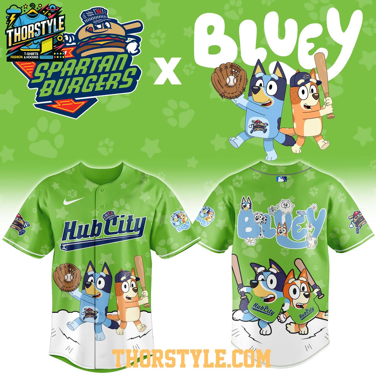 The design features Bluey and Bingo playfully posed in baseball stances, adding a whimsical touch to the traditional baseball jersey. Prominently displayed "Hub City" and "Spartanburgers" logos showcase local pride and team spirit. Reinforced stitching throughout the jersey enhances its durability, ensuring it remains a cherished piece in your wardrobe for seasons to come.