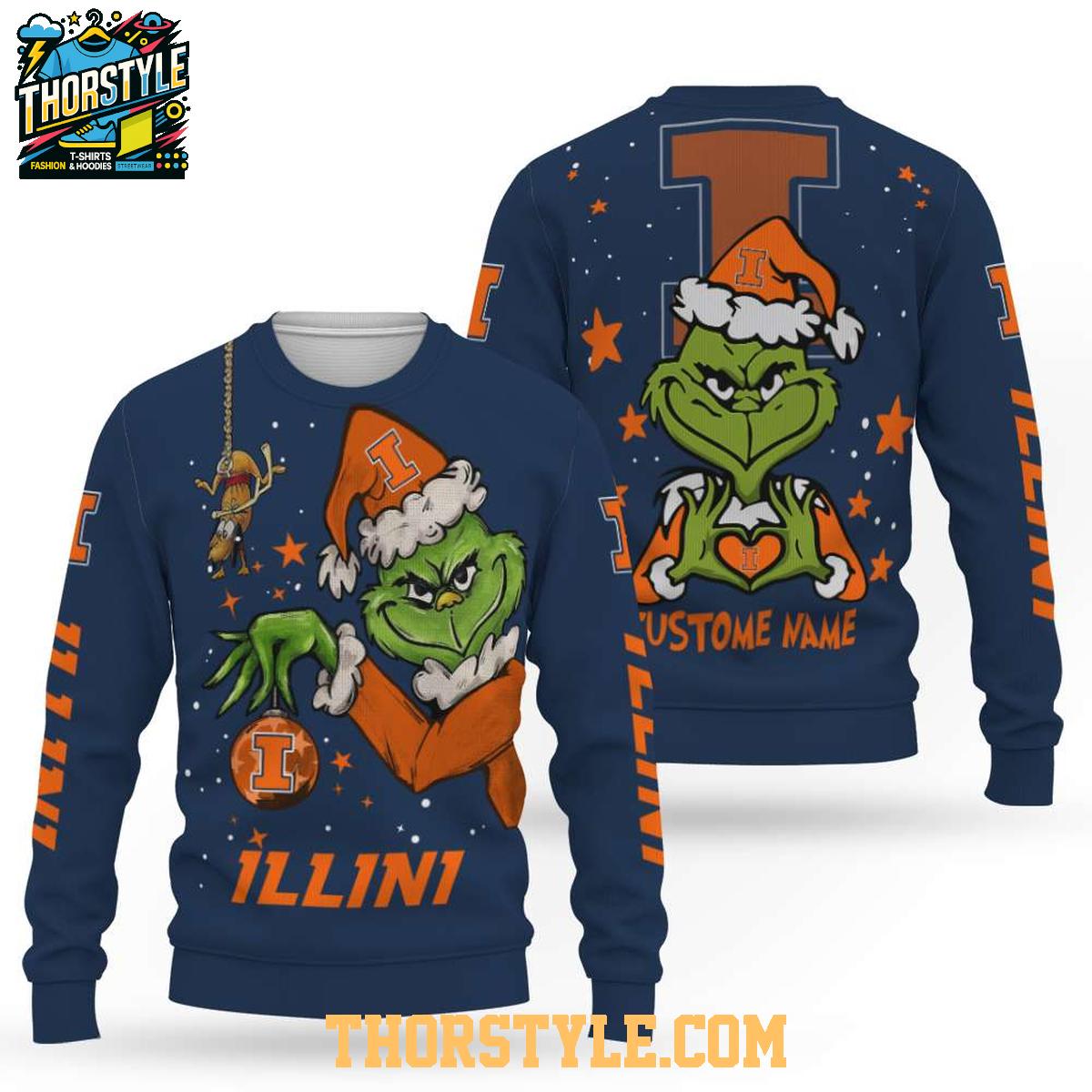 This eye-catching hoodie t-shirt features a vibrant design that incorporates the iconic Grinch character decked out in Illini colors and logos. Imagine wearing this to a holiday gathering, a casual game day watch party, or even just while running errands around town. It's a fantastic conversation starter and a fun way to show off your team pride during the Christmas season. The design includes options for personalization, so you can add your name or a special message, making it an extra special gift for yourself or a fellow Illini fan.