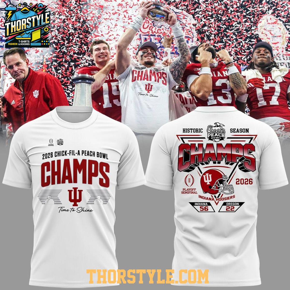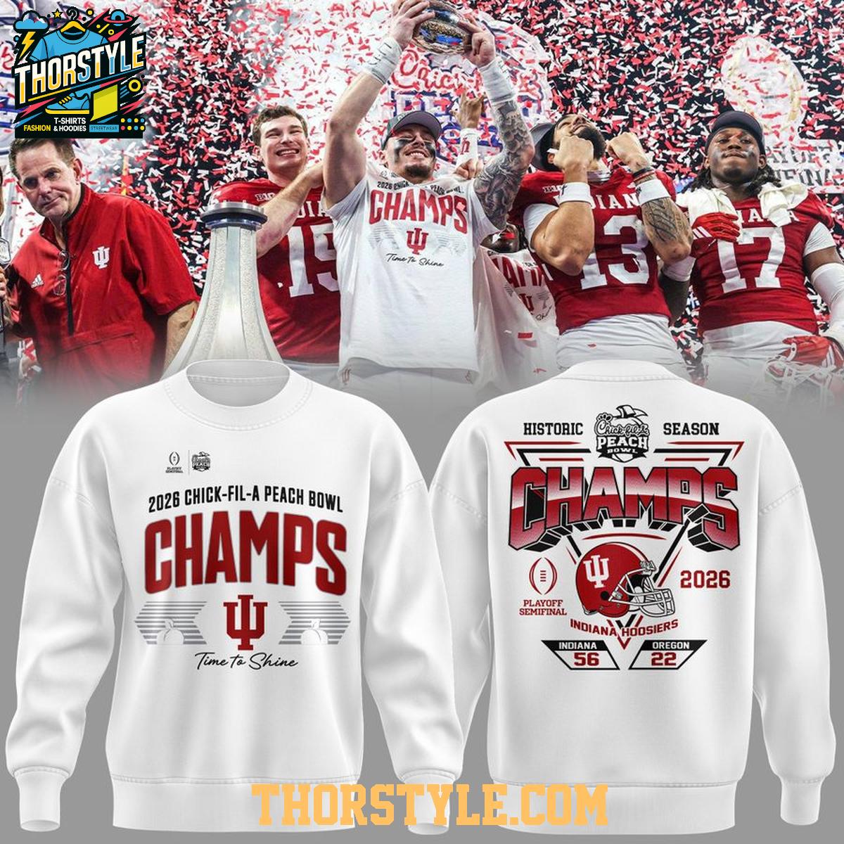 The design captures the energy of the locker room celebration, featuring a bold "CHAMPS" graphic alongside the iconic Indiana University logo. The 2026 Peach Bowl emblem prominently commemorates the Hoosiers' triumphant victory in the playoff semifinal, a testament to their hard work and dedication throughout the season. This hoodie serves as a wearable reminder of the team's success and the unforgettable memories created during that championship run.