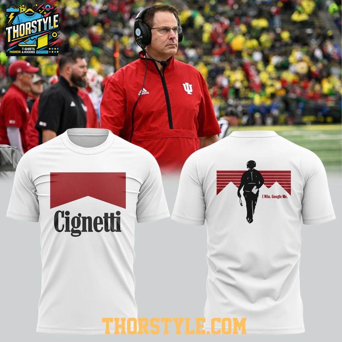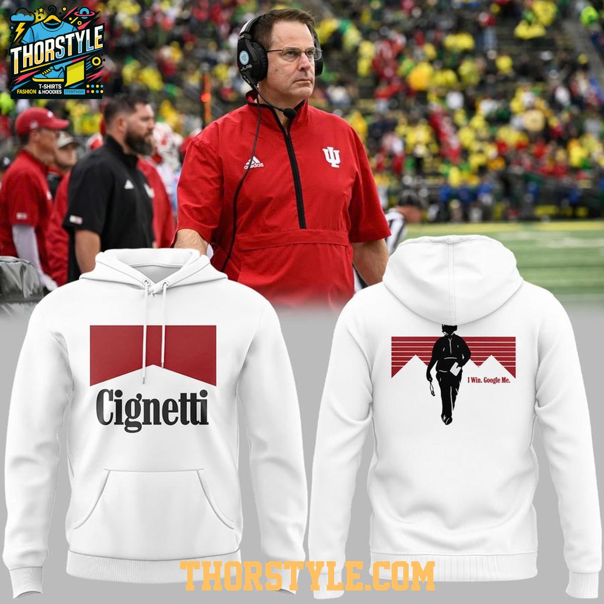 This hybrid hoodie t-shirt features a distinctive design. The front prominently displays "Cignetti" alongside a graphic element, symbolizing leadership and vision. Turning to the back, you'll find a silhouette that captures the essence of victory, accompanied by the playful phrase "I Win. Google Me," adding a touch of modern humor. The design is intended to be eye-catching and conversation-starting, making it a standout piece in any fan's wardrobe.