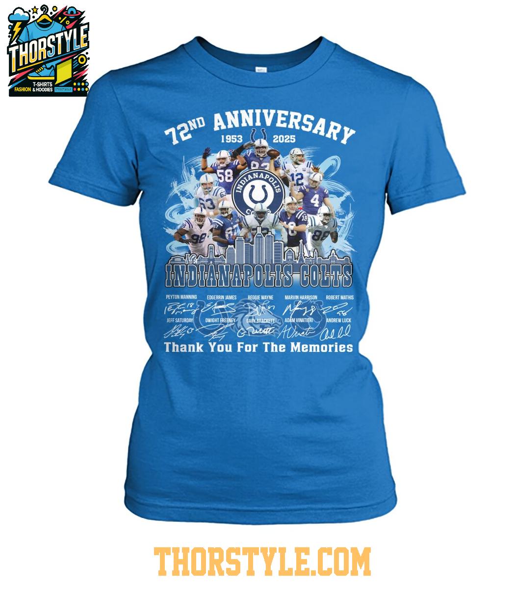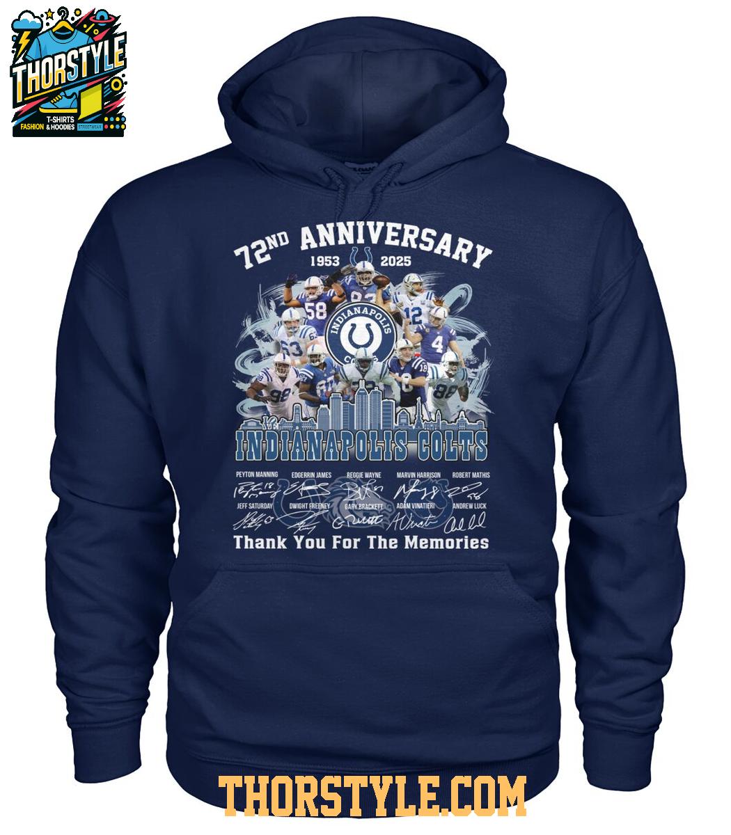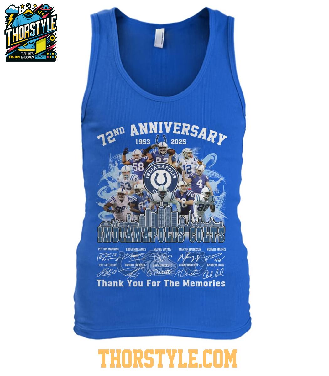 The striking front graphic proudly showcases "72nd ANNIVERSARY 1953-2025," featuring a powerful montage of legendary Colts players in action. Complementing this vibrant display are the team's unmistakable horseshoe logo and a subtle Indianapolis skyline silhouette, anchoring the design in both team identity and hometown pride.