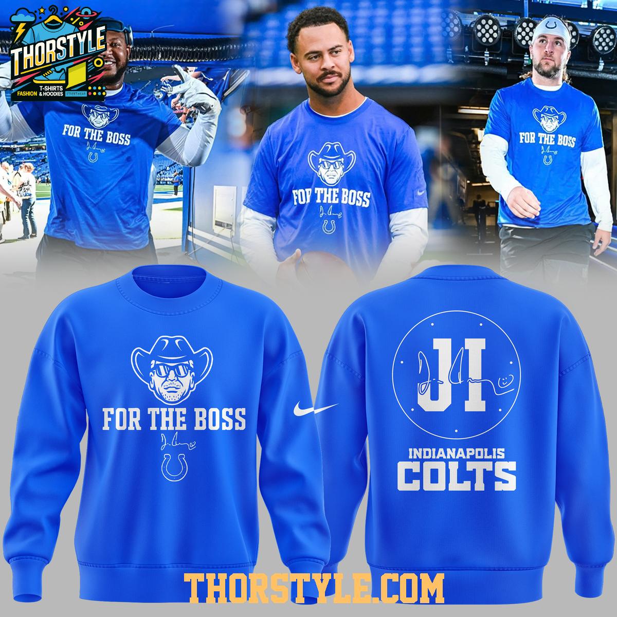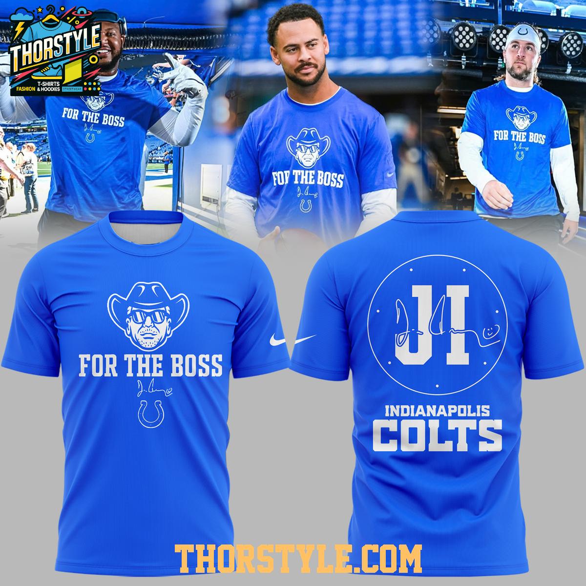 The design is a spirited tribute to Irsay, featuring a stylized graphic incorporating a cowboy hat, a recognizable nod to his personality. This is paired with the powerful phrase "For the Boss" alongside the iconic Colts horseshoe logo, instantly connecting the wearer to the team's leadership and mission. The back of the shirt proudly displays "JI" enclosed within a circle, positioned above the words "Indianapolis Colts," ensuring that your team allegiance is visible from every angle.