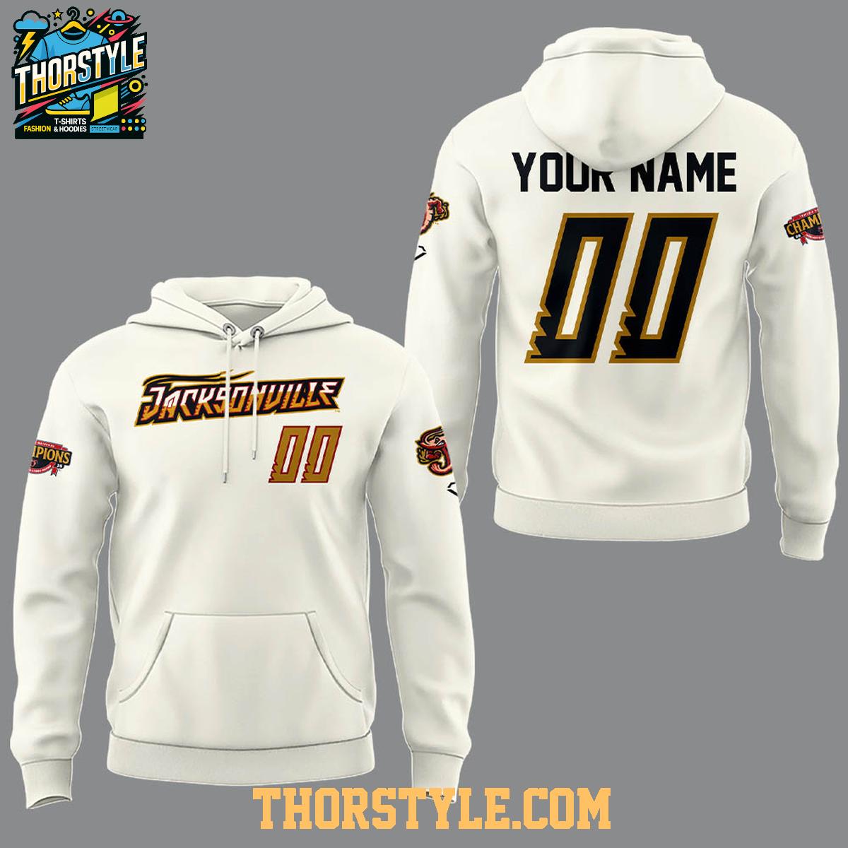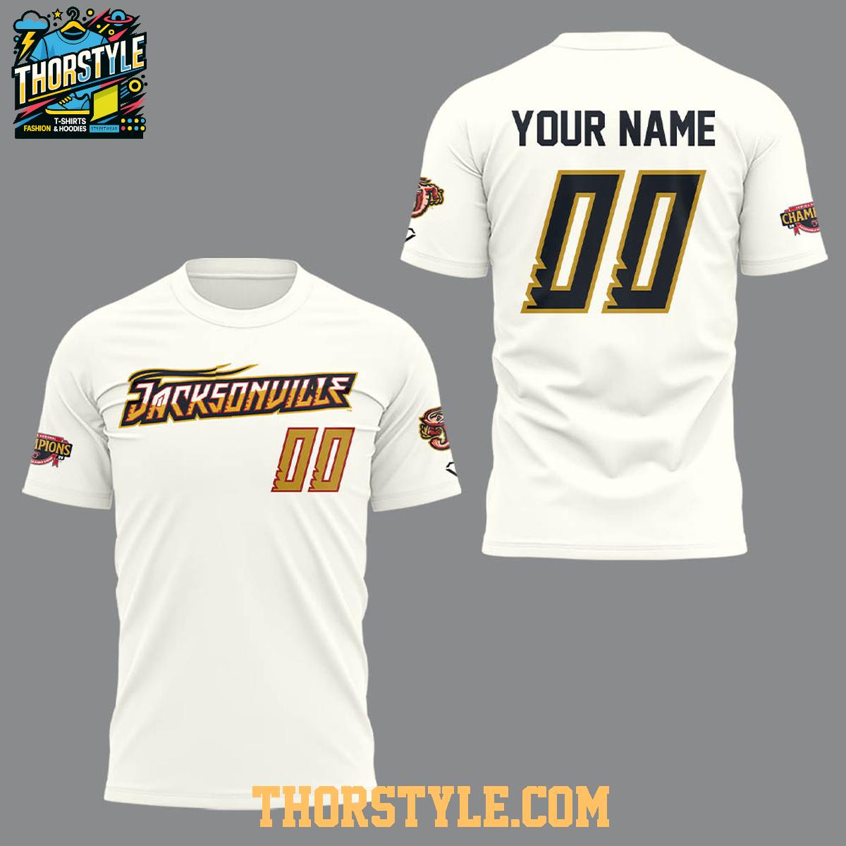 The front of the shirt proudly displays "Jacksonville" above the number. The back can be personalized with "YOUR NAME" to add a unique touch. The design incorporates the team's colors and logo, creating a visually appealing and spirited look. This hoodie t-shirt is more than just apparel; it's a wearable piece of Jacksonville Jumbo Shrimp history.