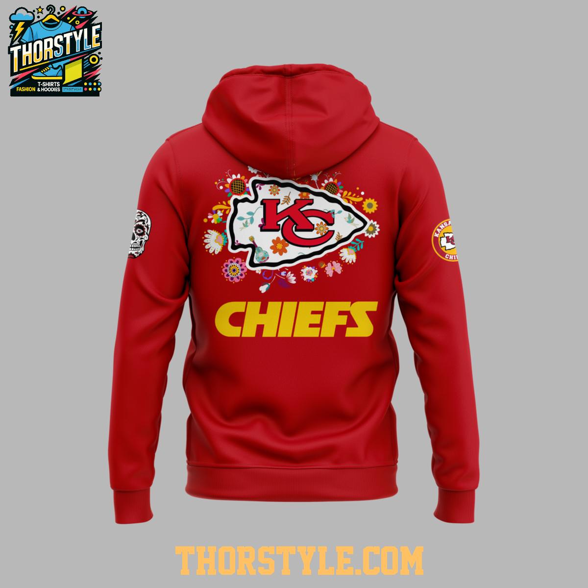 Turning to the back, you'll find the iconic Chiefs logo reimagined with similar festive elements, ensuring a cohesive and visually appealing design. Below the logo, the word "Chiefs" is boldly displayed, further emphasizing your unwavering team loyalty. This hoodie t-shirt also includes a convenient front pocket and a comfortable hood, adding to its practicality and wearability. Made with the devoted fan in mind, this hoodie t-shirt is the perfect way to honor Mexican heritage during Dia De Los Muertos celebrations while proudly displaying your support for the Kansas City Chiefs.