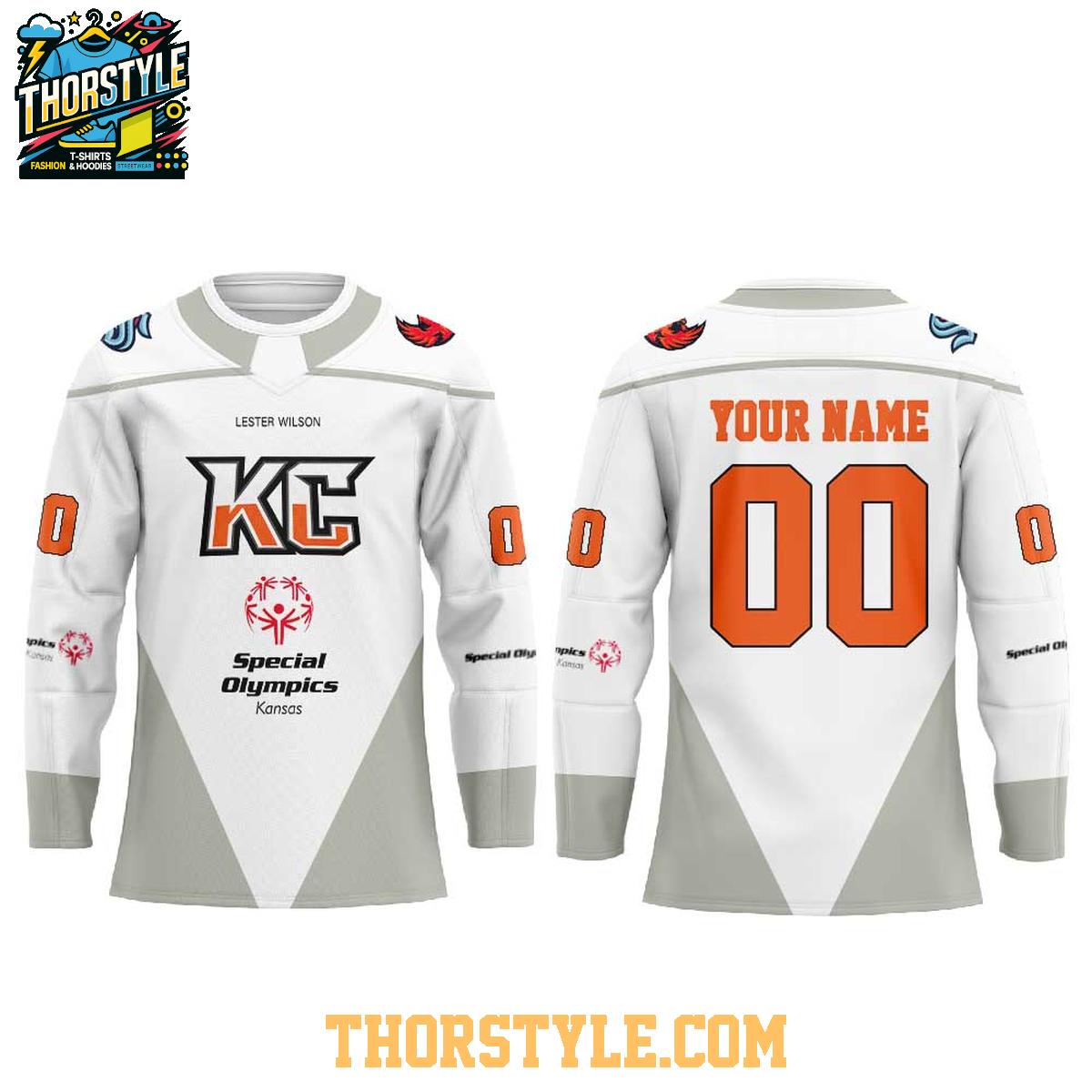 The jersey features the iconic "KC" logo prominently displayed on the front, alongside the Special Olympics Kansas emblem, showcasing a commitment to inclusivity and community support. The sleeves are adorned with unique design elements that celebrate the spirit of competition. What truly sets this jersey apart is the personalization option; add your name and preferred number to the back, making it a one-of-a-kind piece that reflects your individual identity.