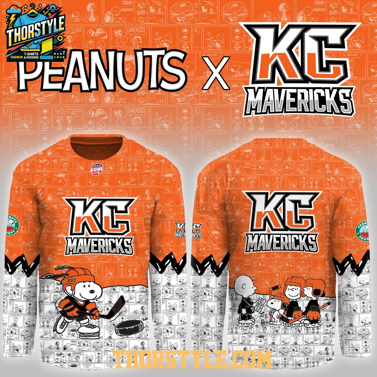 This eye-catching hockey jersey features a vibrant design incorporating the iconic Peanuts comic strips and characters, set against the backdrop of the Kansas City Mavericks team colors. The front prominently displays the Mavericks logo, while Snoopy himself can be seen decked out in hockey gear on the sleeves, ready to hit the ice. The overall design captures the spirit of both the team and the beloved comic strip.