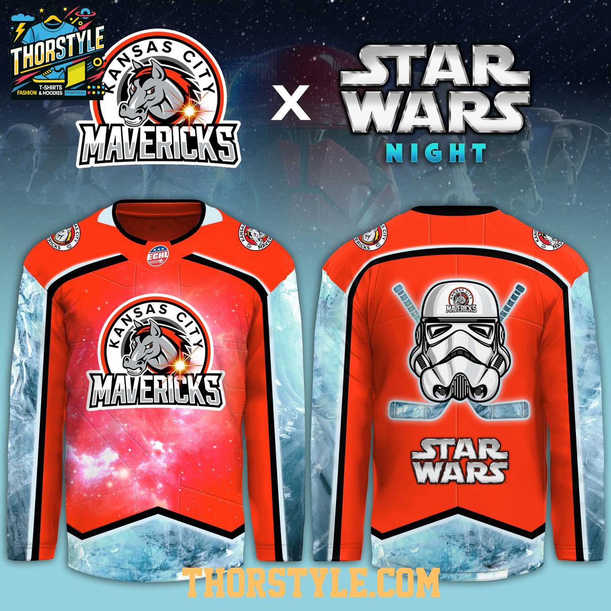 The design features the Kansas City Mavericks logo prominently displayed, intertwined with Star Wars-themed elements. This clever combination creates a visually striking jersey that's sure to turn heads. The attention to detail in the graphics ensures a high-quality, vibrant appearance.