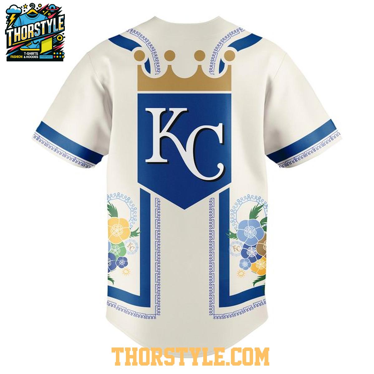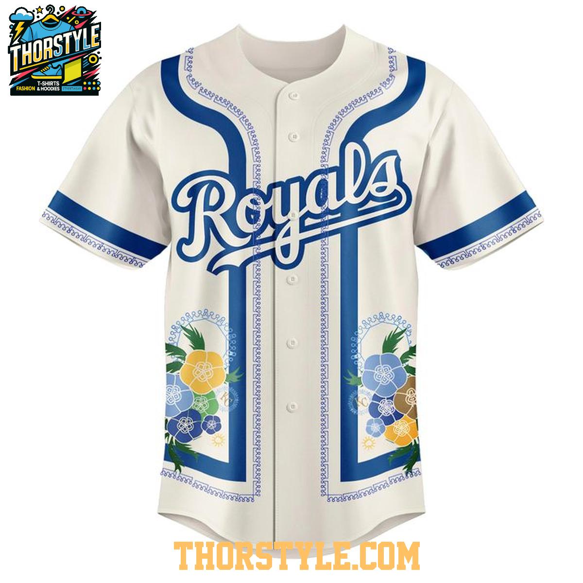 The jersey prominently displays the team name "Royals" emblazoned across the chest in a stylish and eye-catching font, instantly recognizable to fellow fans. Delicate floral accents cascade gracefully down the front, adding a touch of tropical charm and visual appeal. The iconic "KC" logo is proudly featured on the back, solidifying your allegiance to the team. The thoughtful incorporation of these design elements results in a visually stunning and distinctive look that sets this jersey apart from the rest.