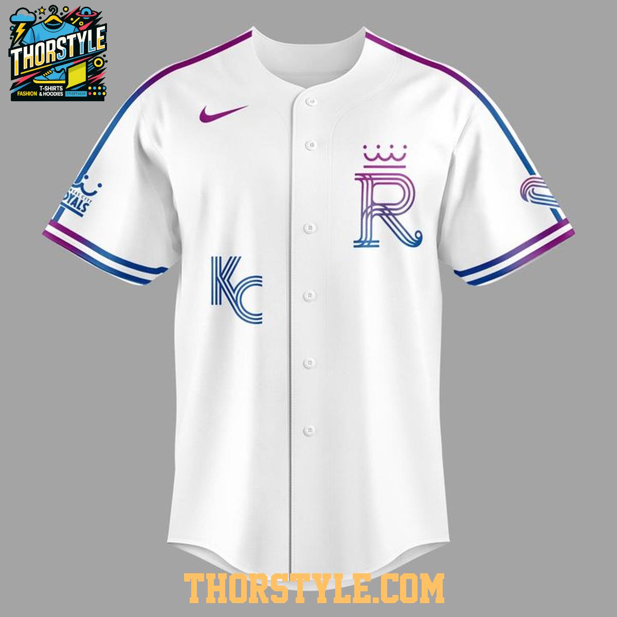 The jersey features the Royals' signature colors and design elements, subtly interwoven with Hello Kitty's adorable aesthetic. Notice the detailed embroidery of the Royals' logo, accented with Hello Kitty-inspired touches. The sleeves are trimmed with stylish accents that complement the overall design, creating a visually appealing and balanced look. This commemorative jersey is perfect for wearing to the ballpark, casual outings, or even themed parties.