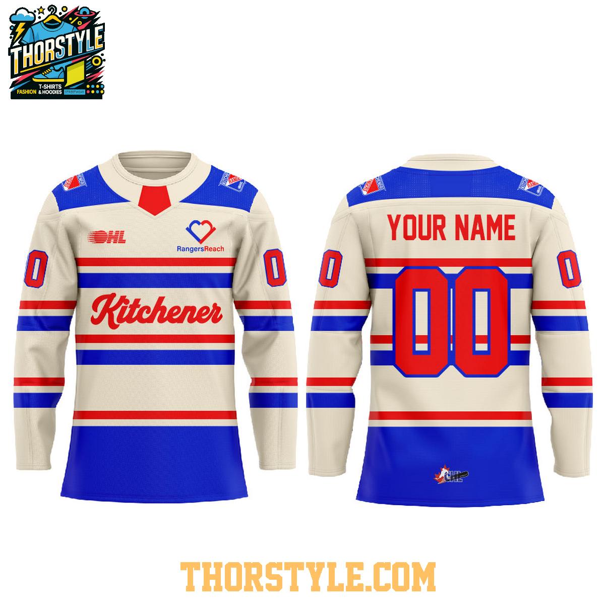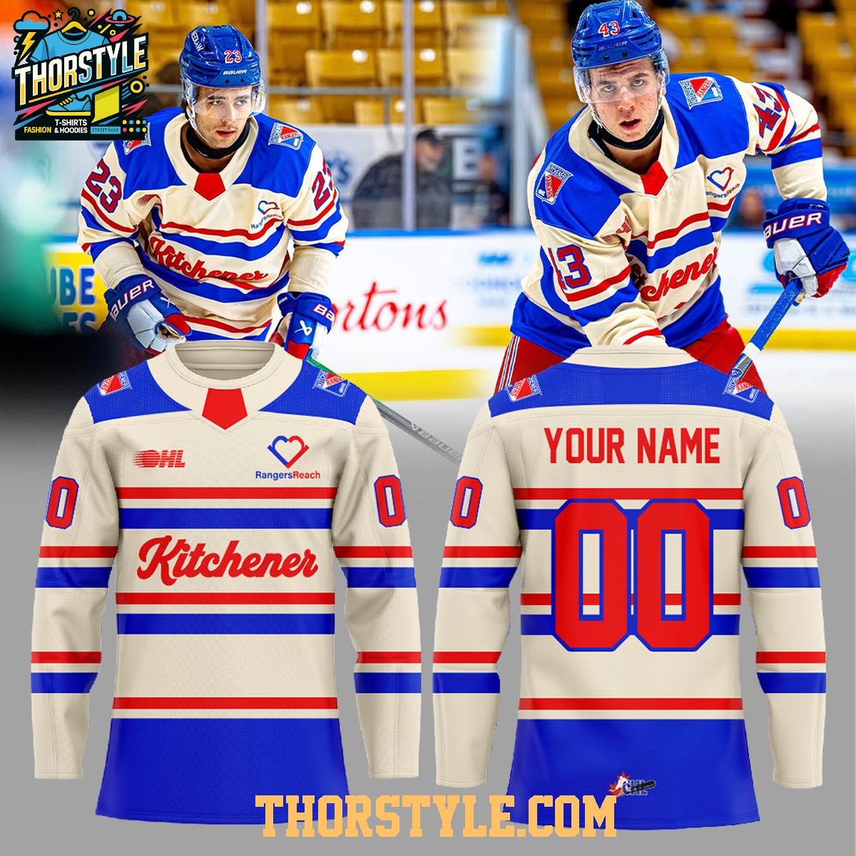Whether you're a die-hard Kitchener Rangers fan, a collector of unique sports memorabilia, or simply looking for a comfortable and stylish jersey to wear, this personalized piece is an excellent choice. Wear it to the game, to a casual get-together, or even while playing a friendly game of pond hockey. It’s a versatile garment that showcases your team spirit and love for the community. The vibrant colors and personalized details are sure to make a statement wherever you go.