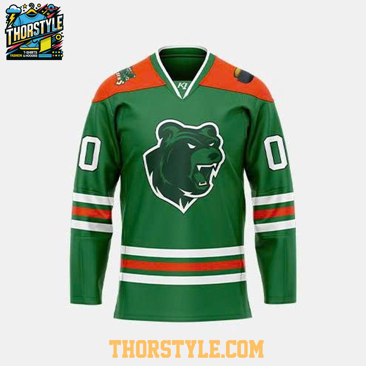 Crafted from high-performance, breathable materials, this hockey jersey offers exceptional comfort and durability. The vibrant green and orange color scheme boldly displays your allegiance, while the prominently featured Ice Bears logo on the front leaves no doubt about your team affiliation. The real standout feature is the personalization option. You can add your name and preferred number to the back, transforming the jersey into a truly one-of-a-kind piece that reflects your individual connection to the team.