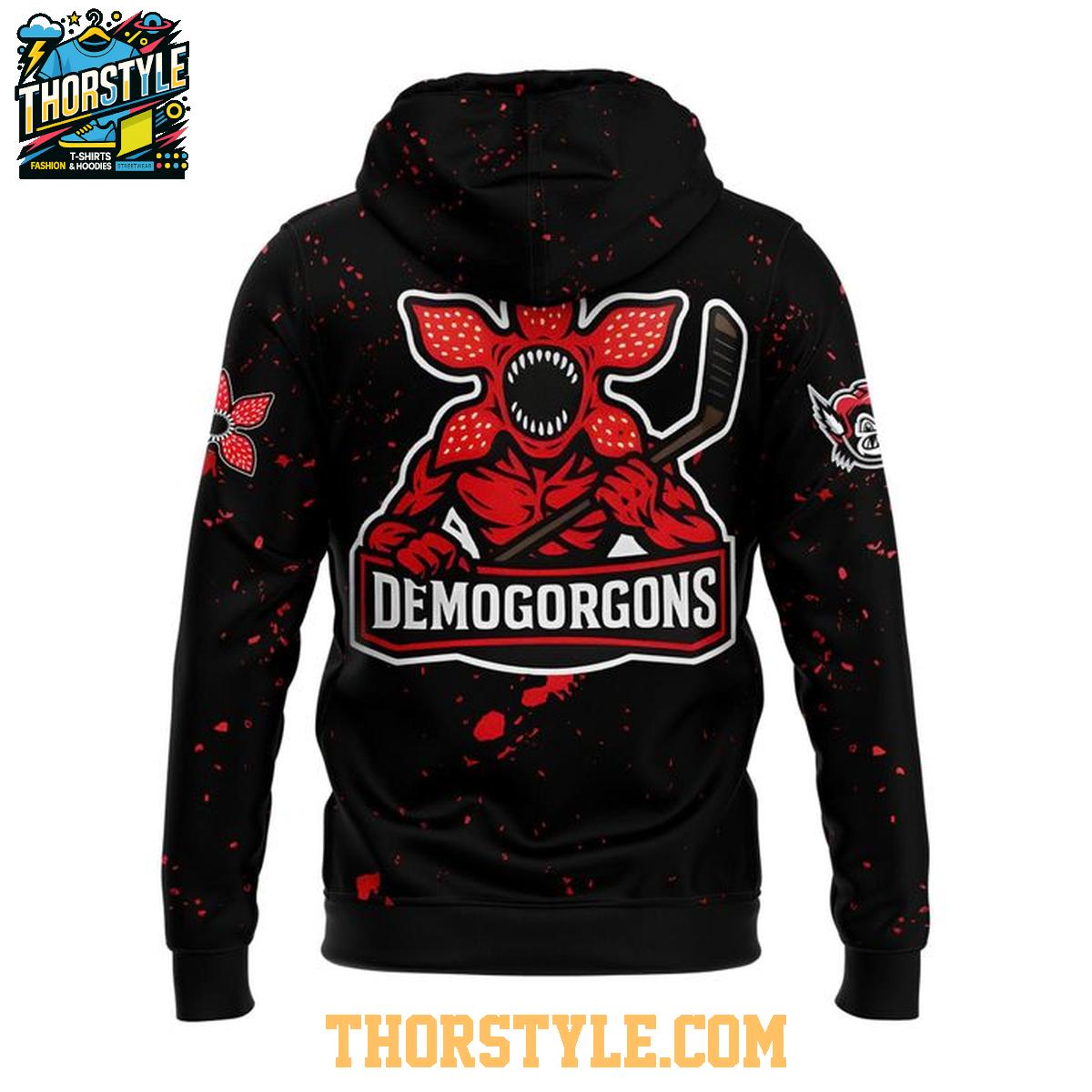 This hoodie t-shirt features bold graphics inspired by the Demogorgons from Stranger Things, cleverly integrated with elements of the Knoxville Ice Bears team. The eye-catching design is printed on a comfortable, breathable fabric, making it ideal for wearing to games, casual outings, or simply lounging at home. The design includes details from the show and the team, creating a unique crossover appeal.