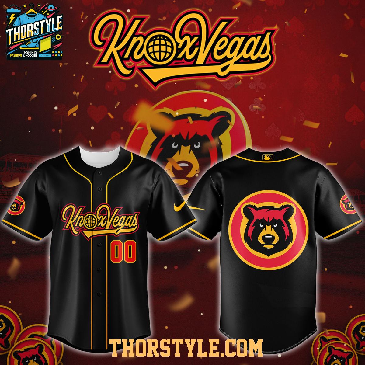 The jersey features bold graphics, including the "Knox Vegas" lettering across the chest and the Smokies' bear logo on the sleeve. The number on the front adds a touch of personalization. The back showcases a larger bear logo, making a statement from any angle. The contrasting trim around the collar and sleeves provides a sharp, athletic look.