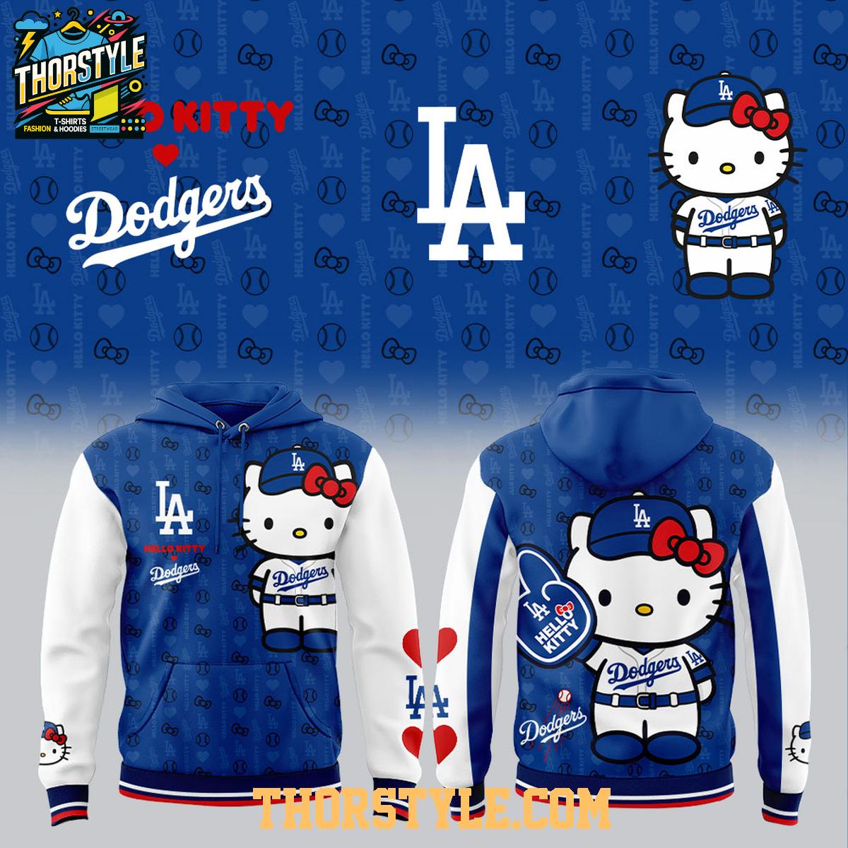 The design stands out with its adorable kawaii-inspired artwork. Featuring Hello Kitty dressed in Dodgers-themed elements—such as a baseball cap or uniform—the hoodie blends pastel tones with the team’s signature colors for a balanced, eye-catching look. Japanese Night influences are reflected through subtle cultural motifs, cute typography, and playful graphic details that bring a fun, youthful energy.