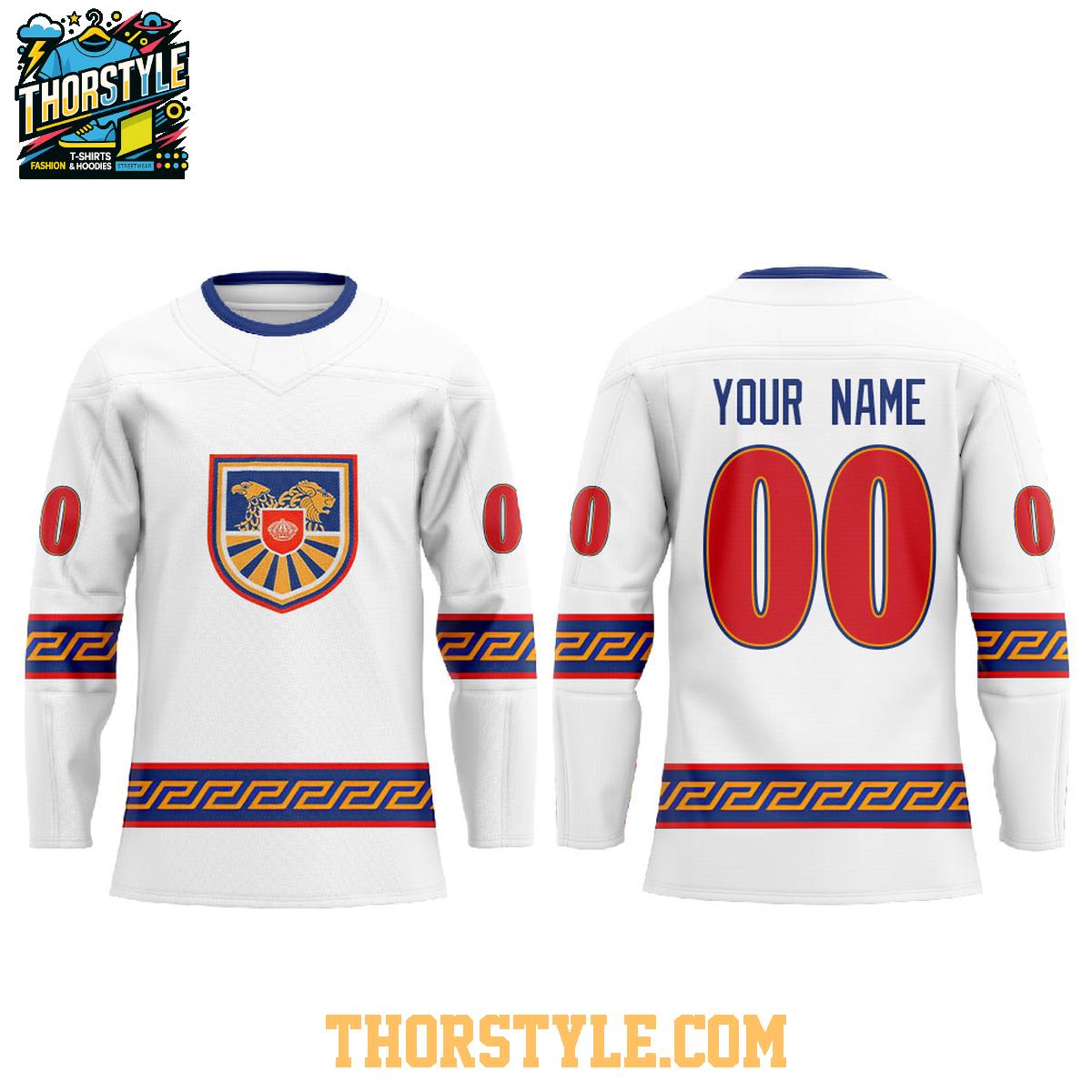 The standout feature is, of course, the personalization option. Add your name and preferred number to the back, creating a truly one-of-a-kind piece that reflects your individual style and connection to both the LA Kings and your Armenian roots. The Armenian coat of arms is prominently displayed, showcasing your heritage with pride. The Kings' colors are subtly incorporated throughout the design, creating a harmonious blend of cultures.