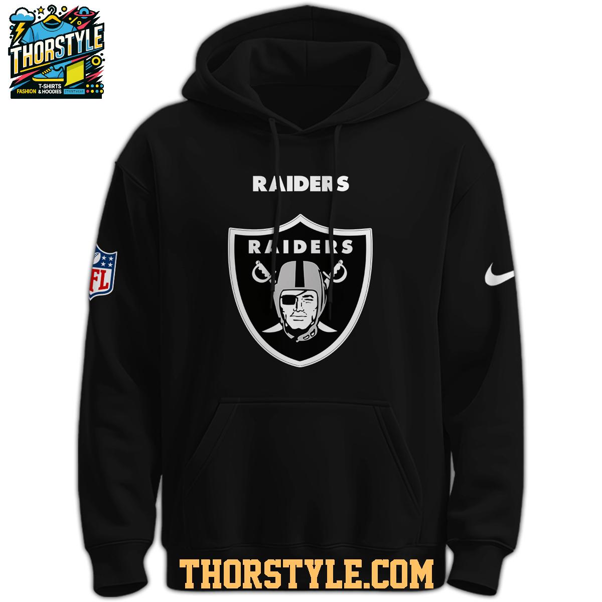 Crafted for the discerning fan, the front proudly showcases the iconic "RAIDERS" text positioned above their legendary shield logo, an instantly recognizable symbol of gridiron dominance. Reinforcing its official status and premium quality, authentic NFL shield and Nike swoosh logos are strategically placed on the sleeves, affirming this as a genuine piece of licensed merchandise.