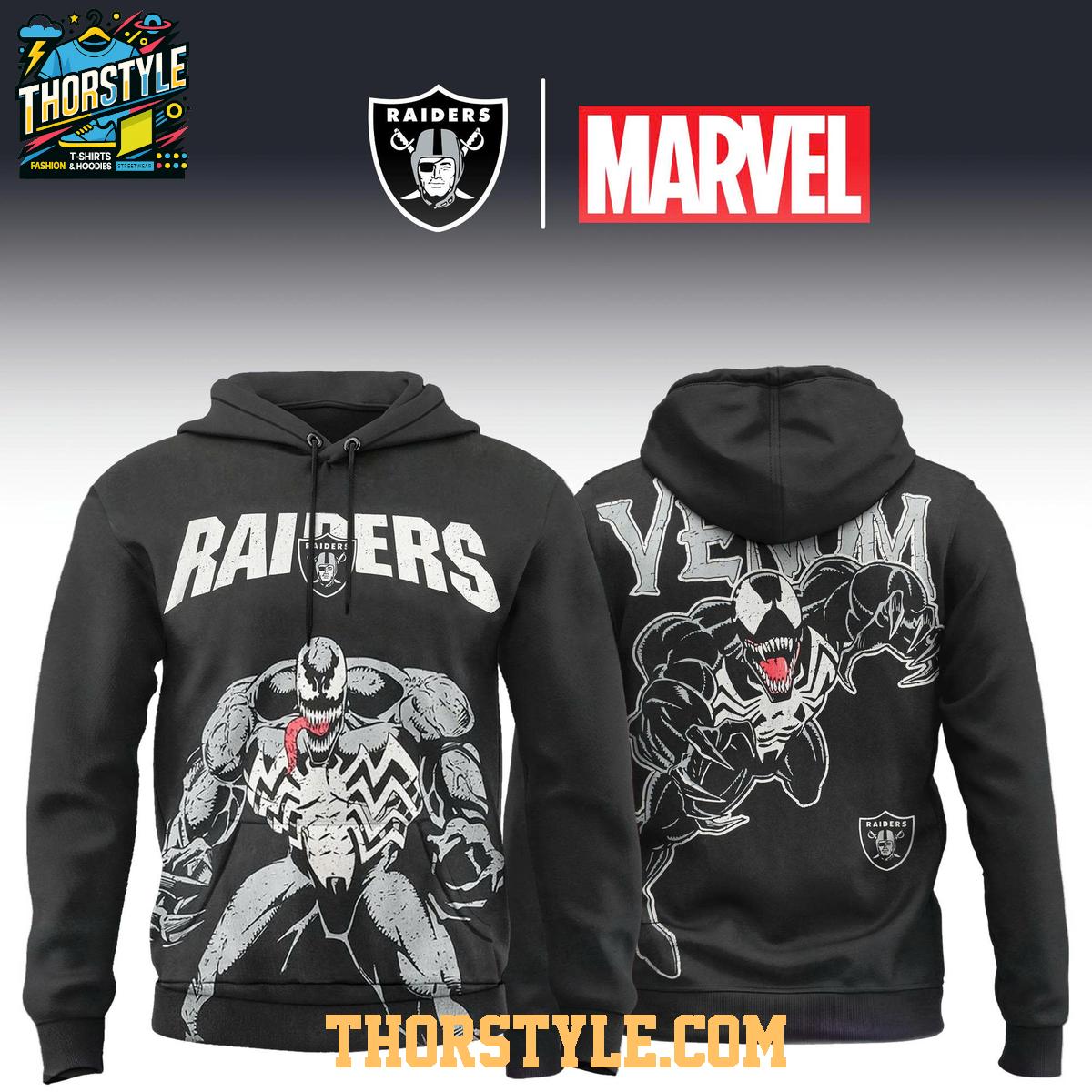 The hoodie boasts a visually arresting design, showcasing Venom as if he's dramatically erupting from the fabric. The Raiders name is boldly positioned above this dynamic graphic, immediately establishing the collaborative spirit of the piece. Turning to the back, an action-packed pose of Venom further amplifies the impact of this unique partnership.