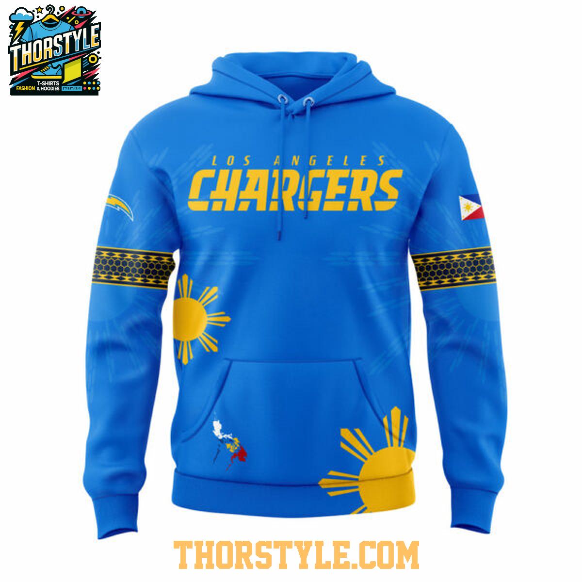 The hoodie prominently features the Los Angeles Chargers logo and team name, integrated seamlessly with design elements inspired by Filipino culture. The vibrant colors and symbolic imagery pay homage to the rich heritage of the Philippines. The design incorporates elements such as the Philippine flag, sun, and stars, creating a visually appealing and meaningful garment.