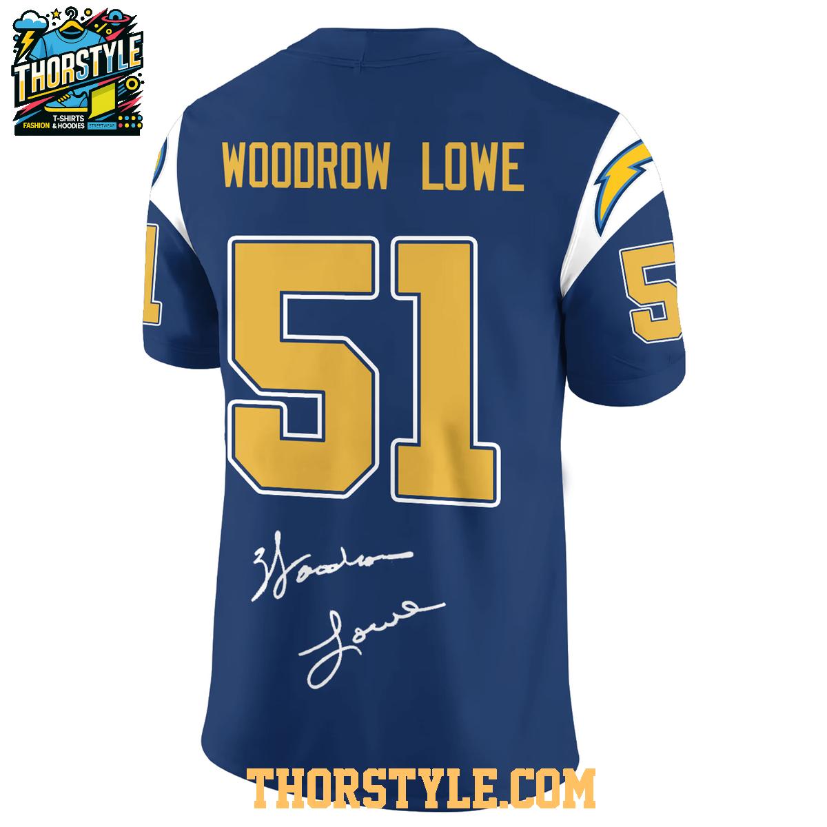 Crafted in the iconic royal blue of the Los Angeles Chargers, this football jersey proudly displays Woodrow Lowe's revered number 51 in crisp gold with striking white outlines. The design seamlessly integrates the distinct Chargers lightning bolt motif on the shoulders, a symbol of electrifying play. On the back, 'WOODROW LOWE' is prominently featured above number 51, complemented by a unique memorial signature graphic, adding a deeply personal touch to this historic garment.