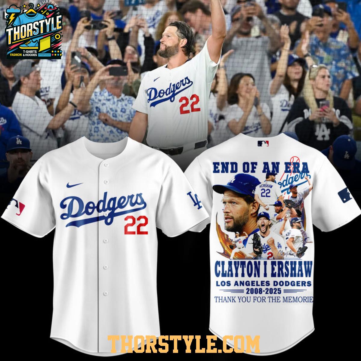 The reverse side presents a powerful "END OF AN ERA" graphic, featuring a striking photo montage of Kershaw's career highlights. Below this evocative imagery, the heartfelt message "CLAYTON KERSHAW LOS ANGELES DODGERS 2008-2025 THANK YOU FOR THE MEMORIES" unequivocally recognizes his incredible journey and profound connection to the team.