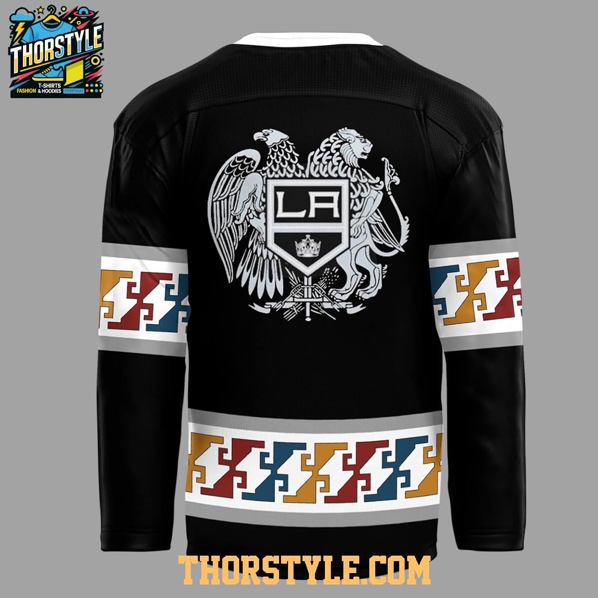 The jersey features a striking black base accented with Armenian-inspired geometric patterns in red, blue, and gold — colors symbolizing the national flag. The front proudly displays the Los Angeles Kings logo in sleek silver, while the back showcases an intricate double-headed eagle emblem holding the Kings crest, representing strength, unity, and resilience.