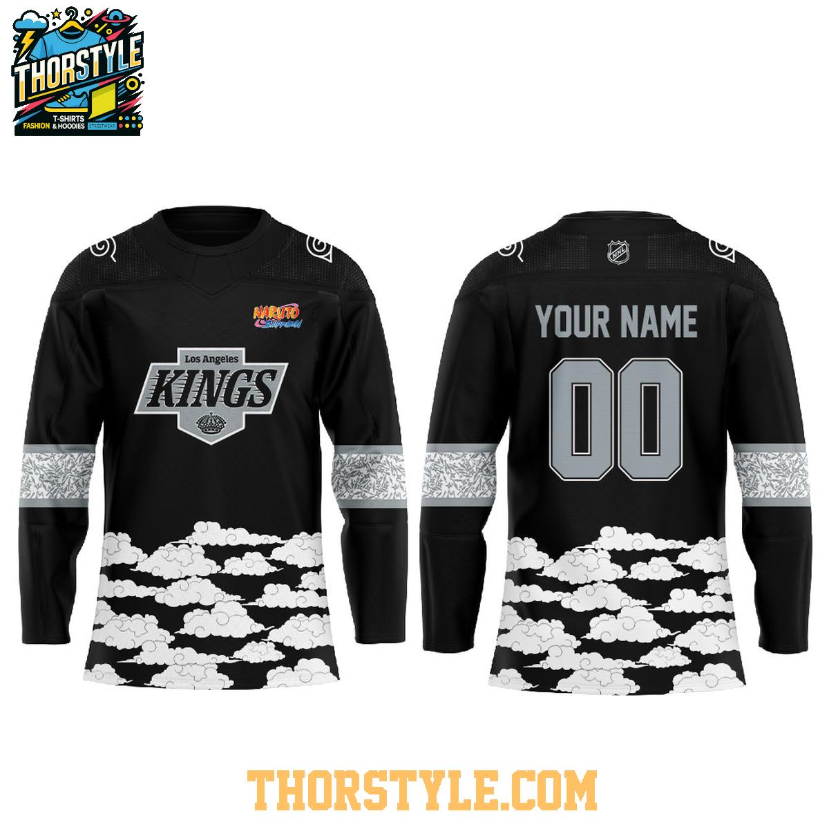 The jersey proudly displays the classic Los Angeles Kings logo prominently on the front, complemented by subtle yet impactful Naruto Shippuden-themed design elements. The distinctive cloud patterns artfully incorporated across the lower portion of the jersey serve as a respectful homage to the Hidden Leaf Village, instantly recognizable to fans of the anime. The sleeves also showcase unique detailing, skillfully blending traditional hockey aesthetics with the artistic flair of anime design.