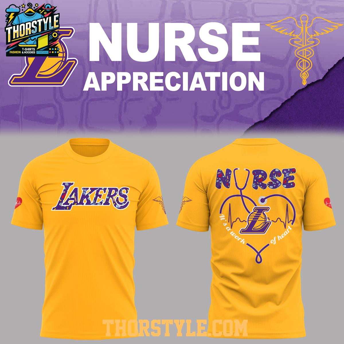 This eye-catching hoodie t-shirt proudly displays the Lakers' signature colors and logo, instantly recognizable to any basketball enthusiast. The design thoughtfully incorporates elements honoring nurses, including a stethoscope graphic and the inspiring phrase "Nurse Appreciation," creating a powerful symbol of respect and admiration. The back design features the word "NURSE" and the touching sentiment "It's a work of heart" encircling the Lakers logo, further emphasizing the dedication and compassion inherent in the nursing profession.