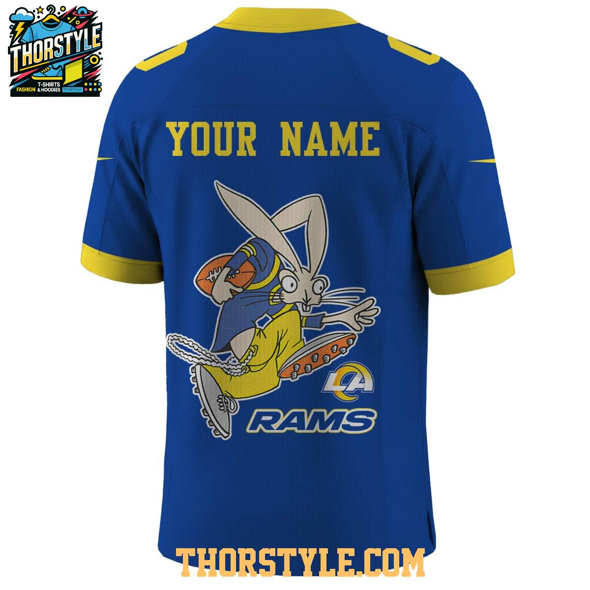 Show off your unique style with the Los Angeles Rams Blink-182 Missionary Impossible Personalized Football Jersey. This one-of-a-kind jersey merges your love for the Rams, the iconic pop-punk band Blink-182, and the timeless cool of Bugs Bunny in a football theme. It's a bold statement piece that's sure to turn heads whether you're at the game, a concert, or just hanging out with friends.