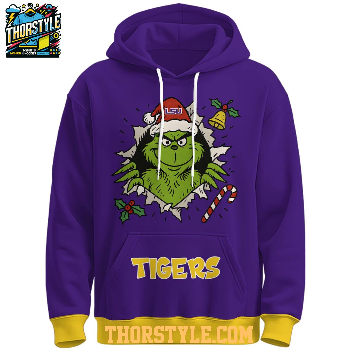 This eye-catching hoodie t-shirt features a bold graphic of the Grinch, sporting an LSU Santa hat, seemingly bursting through the fabric, complete with festive Christmas elements. The word "Tigers" is prominently displayed. Turn around, and you will find a hilarious Grinch-themed message that is sure to get a laugh.
