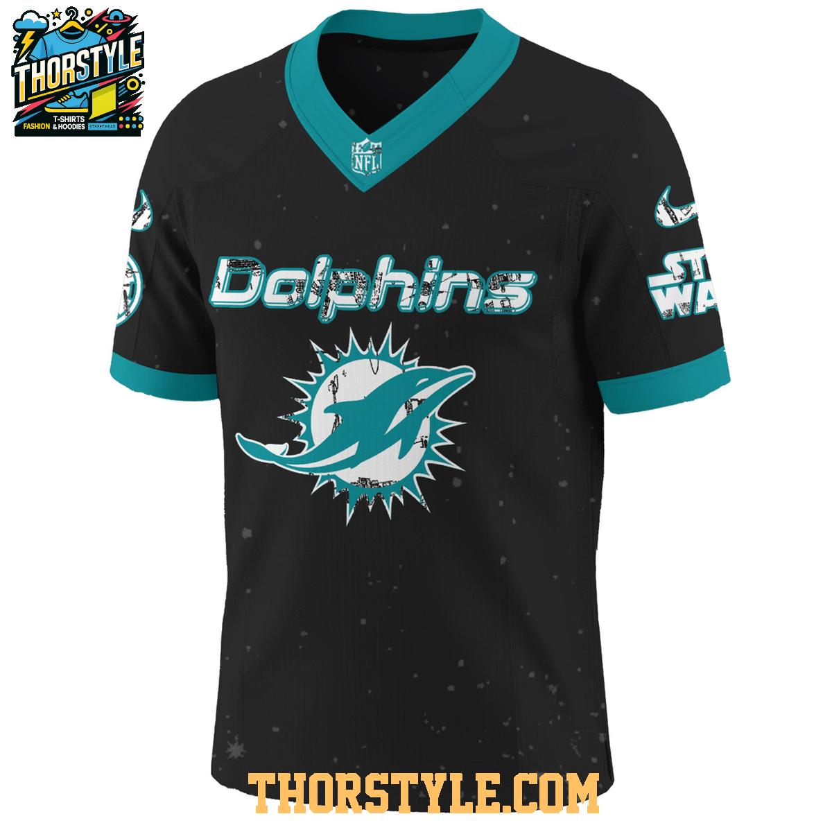 The front proudly displays the classic Miami Dolphins logo and team name, set against a sleek black backdrop that enhances its striking visual appeal. Signature teal V-neck and sleeve cuffs provide a vibrant pop of color, anchoring the design firmly in Dolphins tradition. An official NFL shield on the collar signifies its authenticity as premium football fan gear, while subtle Star Wars branding on the sleeve offers a discreet yet powerful hint at the epic crossover within this unique garment.