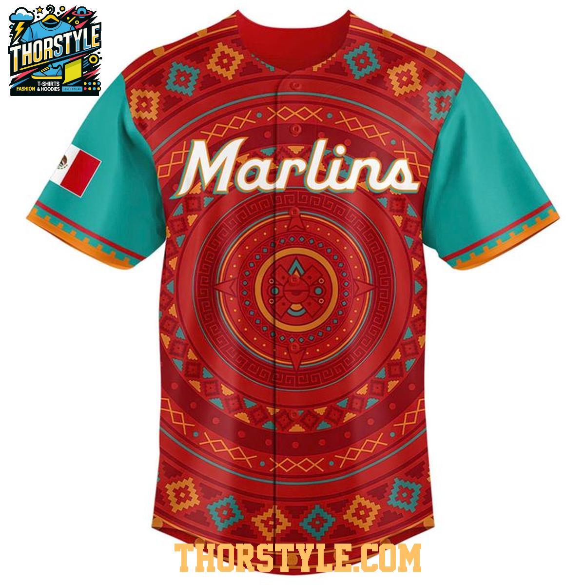 This special edition jersey features bold, eye-catching graphics that pay homage to Mexican heritage. The intricate patterns and vibrant colors are seamlessly integrated with the Marlins' iconic team logo, resulting in a visually stunning design. The jersey's construction focuses on comfortable wear, whether you're at the ballpark, a casual gathering, or simply showing off your team spirit around town.