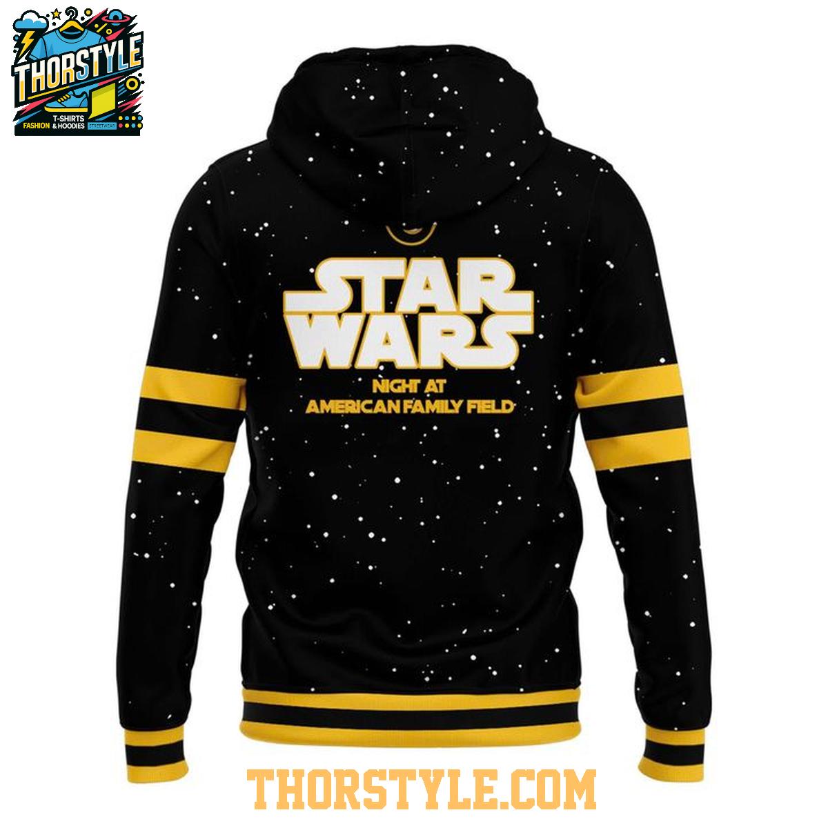 This hoodie shirt prominently features the "Brewers" team name on the front, along with the Star Wars logo, making it clear where your allegiances lie. The design incorporates elements of the Star Wars universe, such as a galaxy-inspired backdrop and event-specific details like "Night at American Family Field," commemorating the special occasion. The classic hoodie design includes a comfortable hood and a front pouch pocket, perfect for keeping your hands warm or storing small essentials.