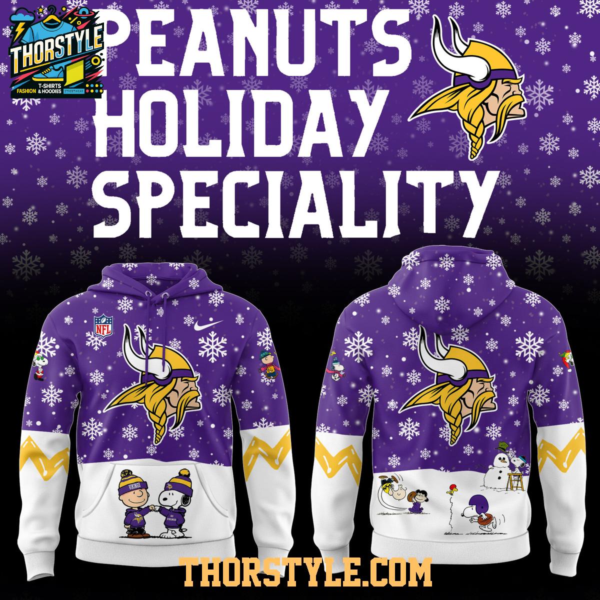 The hoodie t-shirt features a vibrant purple base, instantly recognizable as Vikings territory, adorned with a charming snowflake pattern that evokes the magic of the holidays. Beloved Peanuts characters are playfully depicted enjoying various winter activities, adding a touch of heartwarming nostalgia to the design. The iconic Minnesota Vikings logo is prominently displayed, ensuring your team allegiance remains front and center.